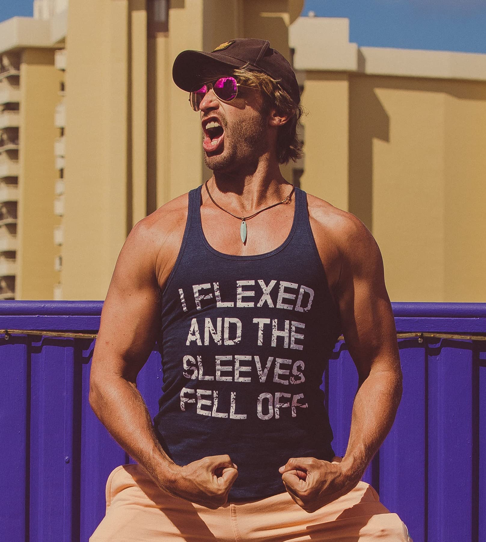 Details: My guns are so big, they're just like, out there. I am so muscular that I popped the sleeves right off my shirt. It's time to get your flex on and bust out of those sleeves. Summer is coming and its cutting season! This mens exercise tank top is great for the gym or the beach. Buy this tank today and show off your glistening biceps as well as your shining sense of humor. This shirt is sure to get a laugh from your gym friends or crossfit buddies.