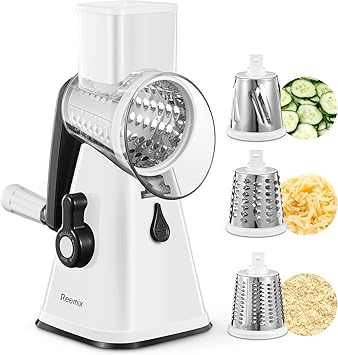 Cheese Grater, Reemix Rotary Cheese Grater with Handle, Kitchen Rotary Mandoline Vegetable Slicer with 3 Replaceable Stainless Steel Blades, for Nuts, Vegetable, Chocolate, Chesse (White)