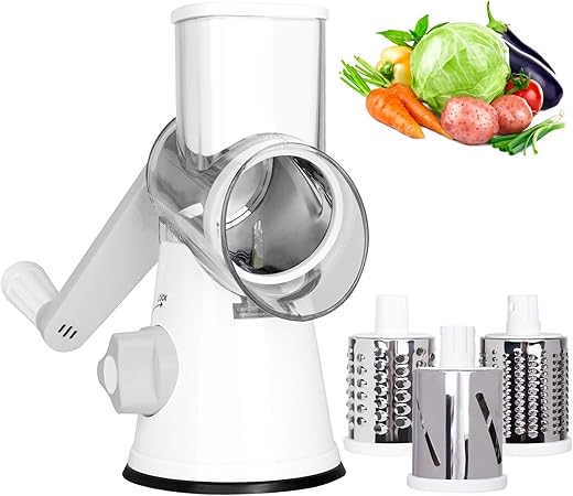 X Home Rotary Cheese Grater Hand Crank, Cheese Shredder with 3 Interchangeable Blades, Vegetable Slicer with Strong Suction Base, Easy to Use and Clean, White