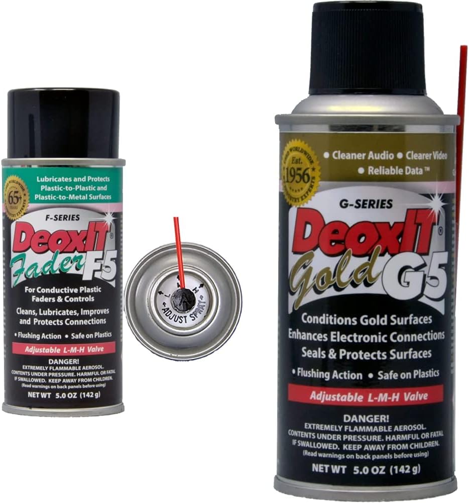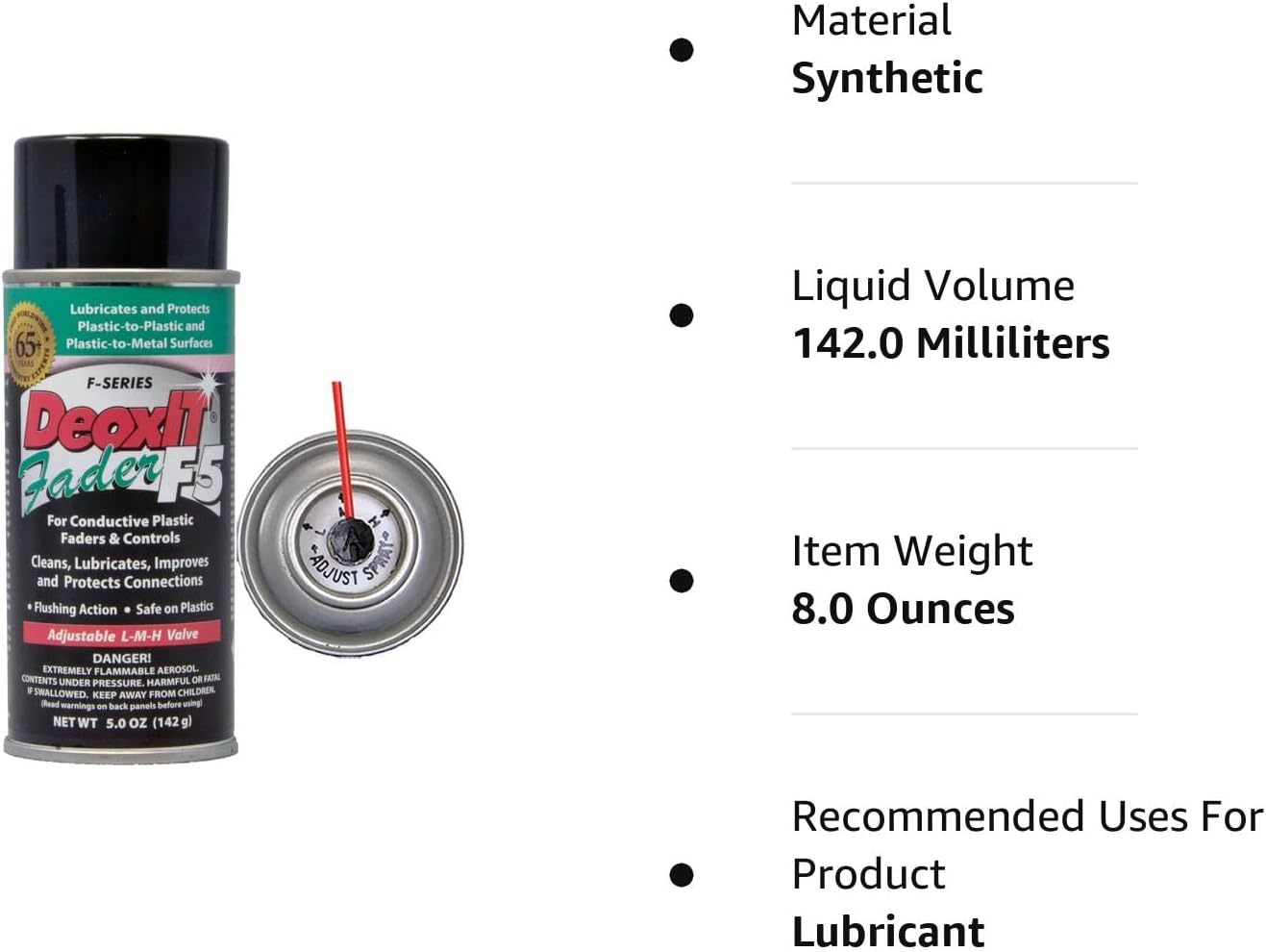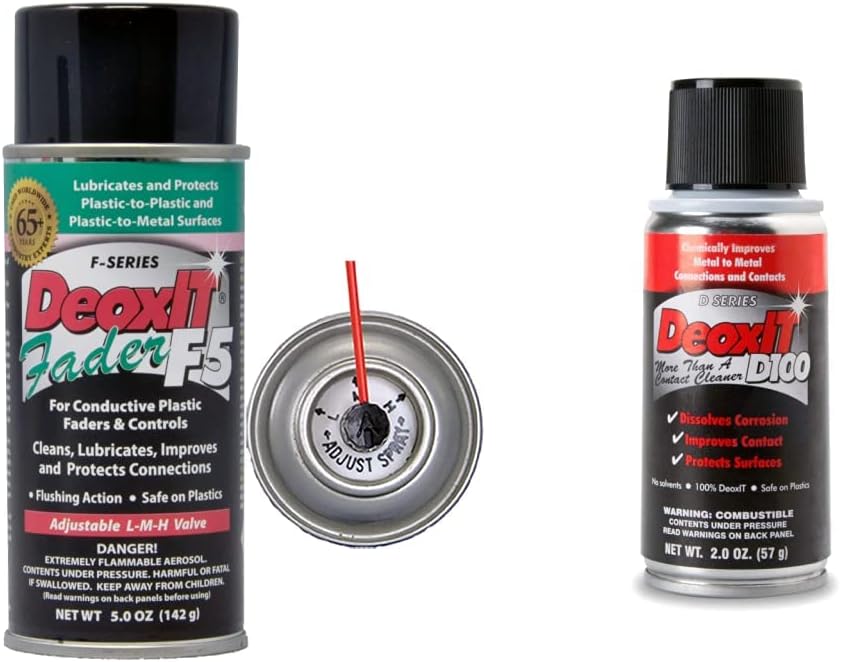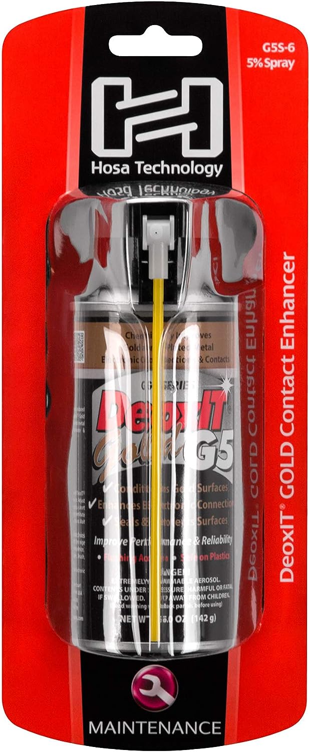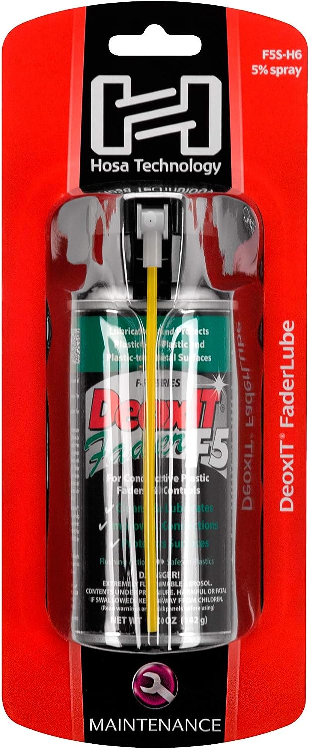 Hosa F5SH6 CAIG DeoxIT Fader Lube Contact Cleaner Spray is specifically designed for use on conductive plastic and carbon compounds. This F5SH6 contact cleaner spray was designed for use as a general treatment for connectors, contacts, and other surfaces. More than a just any contact cleaner, Hosa DeoxIT chemically improves conductive connections to ensure clean and clear sounds. The Hosa D5S6 DeoxIT is an essential accessory every musician must have!