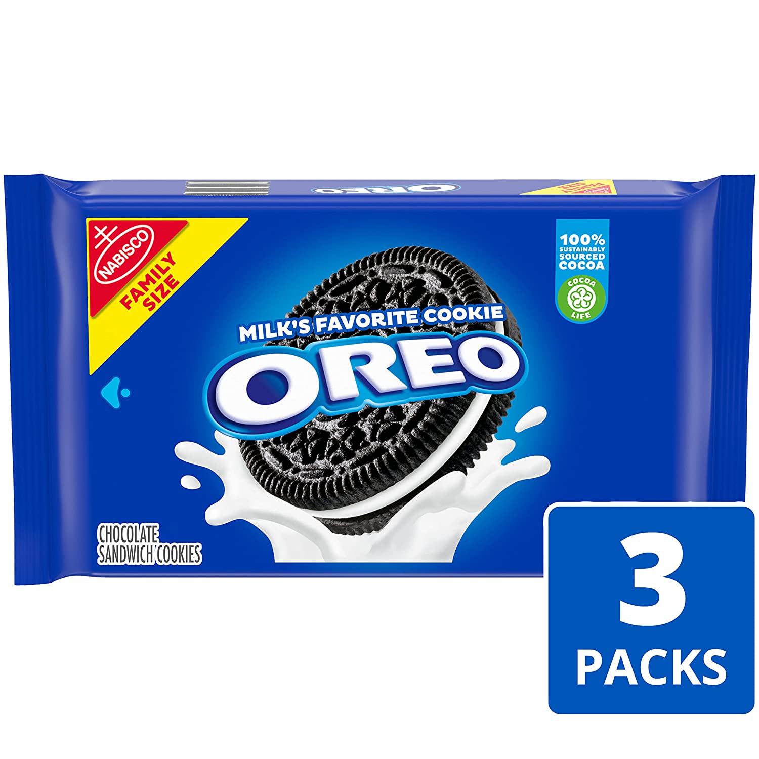 Take a delicious break with OREO Chocolate Sandwich Cookies, America's favorite sandwich cookie for over 100 years. Supremely dunkable, OREO cookies sandwich a rich creme filling between the bold taste of two chocolate wafers--making them milk's favorite cookie. Original OREO chocolate sandwich cookies are great for serving as a dessert, with ice cream, as party snacks at your next gathering or for packing sweet snacks with lunch at school or work. You can even mix these bulk cookies into your favorite dessert recipe or cheesecake recipe for something a little extra special. The resealable package of OREO cookies with easy-pull tab keeps chocolate cookies fresh and is great for snacking, sharing or traveling. With three packs of OREO Sandwich Cookies, you'll stay stocked for any snacking occasion: even cookies for Santa. Cocoa Life: 100% Sustainably Sourced Cocoa; OREO partners with Cocoa Life to help support sustainable cocoa sourcing. Cocoa life works together with farmers to grow cocoa in ways that help protect people and the planet. For more information visit the Cocoa Life website.