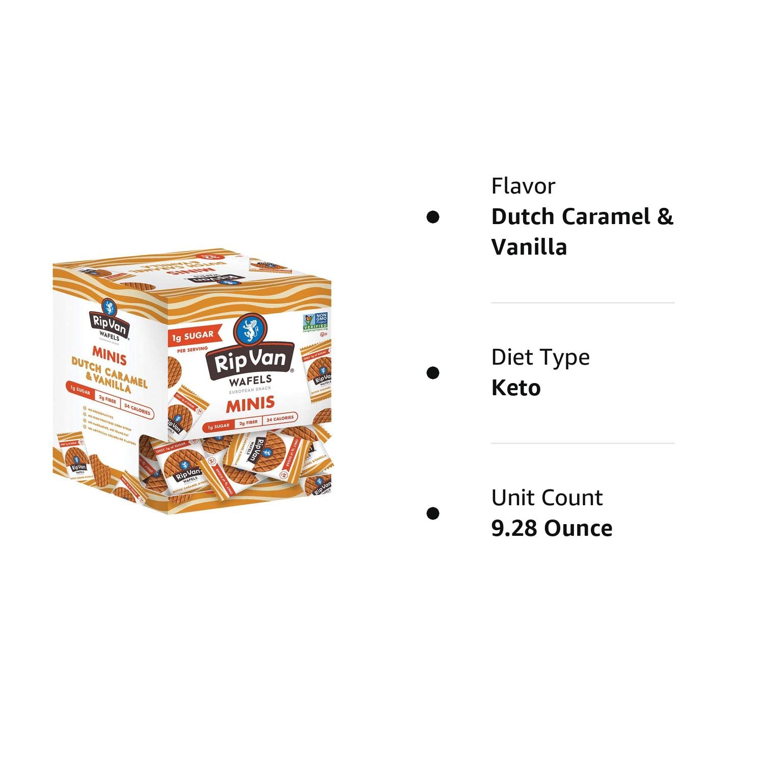 Rip Van Wafels Dutch Caramel & Vanilla Mini Stroopwafels - Low Carb Snacks (3g Net Carbs) - Non GMO Snack - Keto Friendly - Office Snacks - Low Calorie Snack (34 Calories) - Low Sugar (1g) - 32 Pack