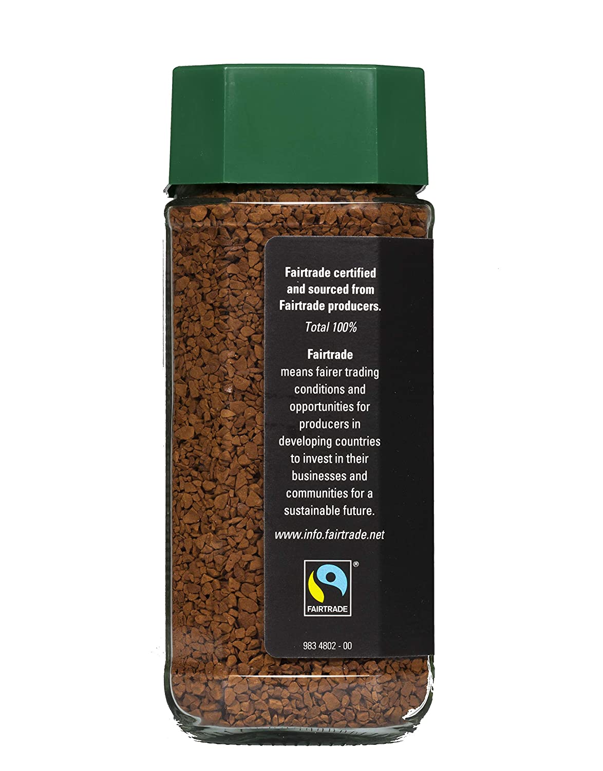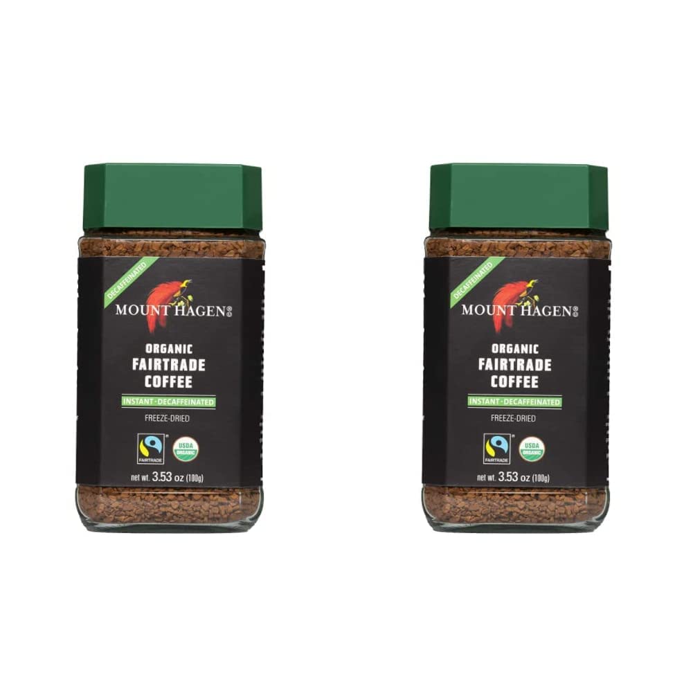 Decaffeinated Organic Instant coffee in jar. Net 3.5oz/100g. Mount Hagen Organic Decaf Instant Coffee in Jar is perfect for those that love coffee but don't want the caffeine. Mount Hagen uses a patented process involving just water and carbon dioxide to extract virtually all of the caffeine without removing the rich aroma and full-bodied taste. This freeze-dried instant coffee is made from Organic, Fairtrade, 100% Arabica coffee beans. The beans are shade grown at higher elevations which produces a naturally flavorful, yet mild taste. This coffee has special appeal for those interested in organic, fair-trade, decaffeinated coffee with the convenience of an instant. It's great for travelers, campers, students, and small households. Mount Hagen's goal is to create the perfect coffee - which is far more than a matter of taste! Nothing but fresh Arabica beans from the best high-altitude regions go into Mount Hagen coffee. These beans are procured exclusively from their country of origin and are ecologically cultivated by small-scale farmers under Fairtrade conditions. The beans undergo gentle roasting and refining to select only the finest beans to go into Mount Hagen coffee. Each serving (approximately 2-3 grams) of Mount Hagen Decaf Instant Coffee contains less than 6-9mg of caffeine. One 3.53 oz. jar yields approximately 60 generous cups of delicious coffee. Imported from Europe.