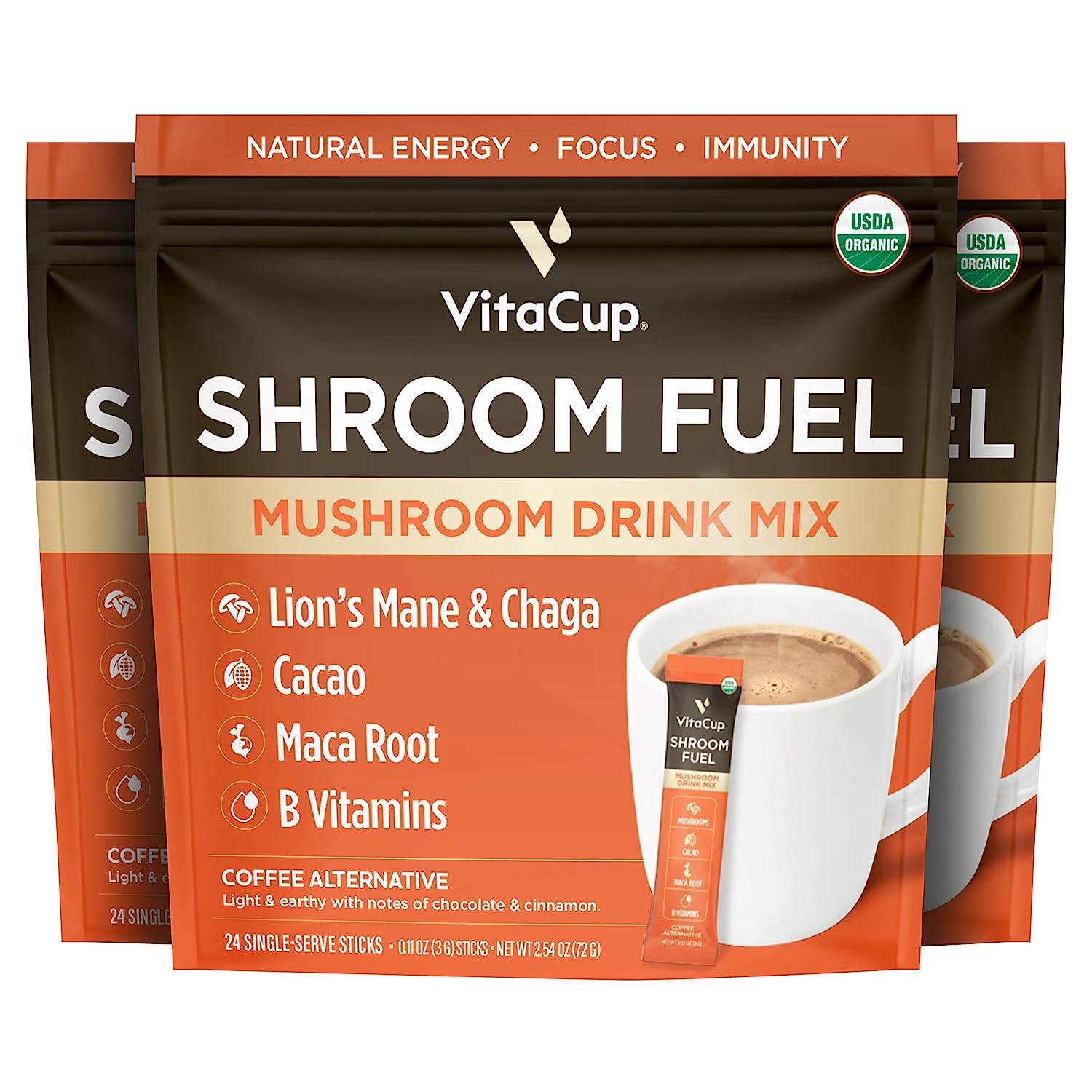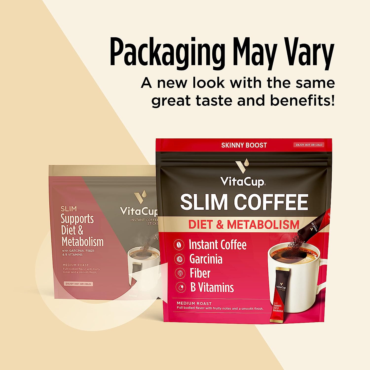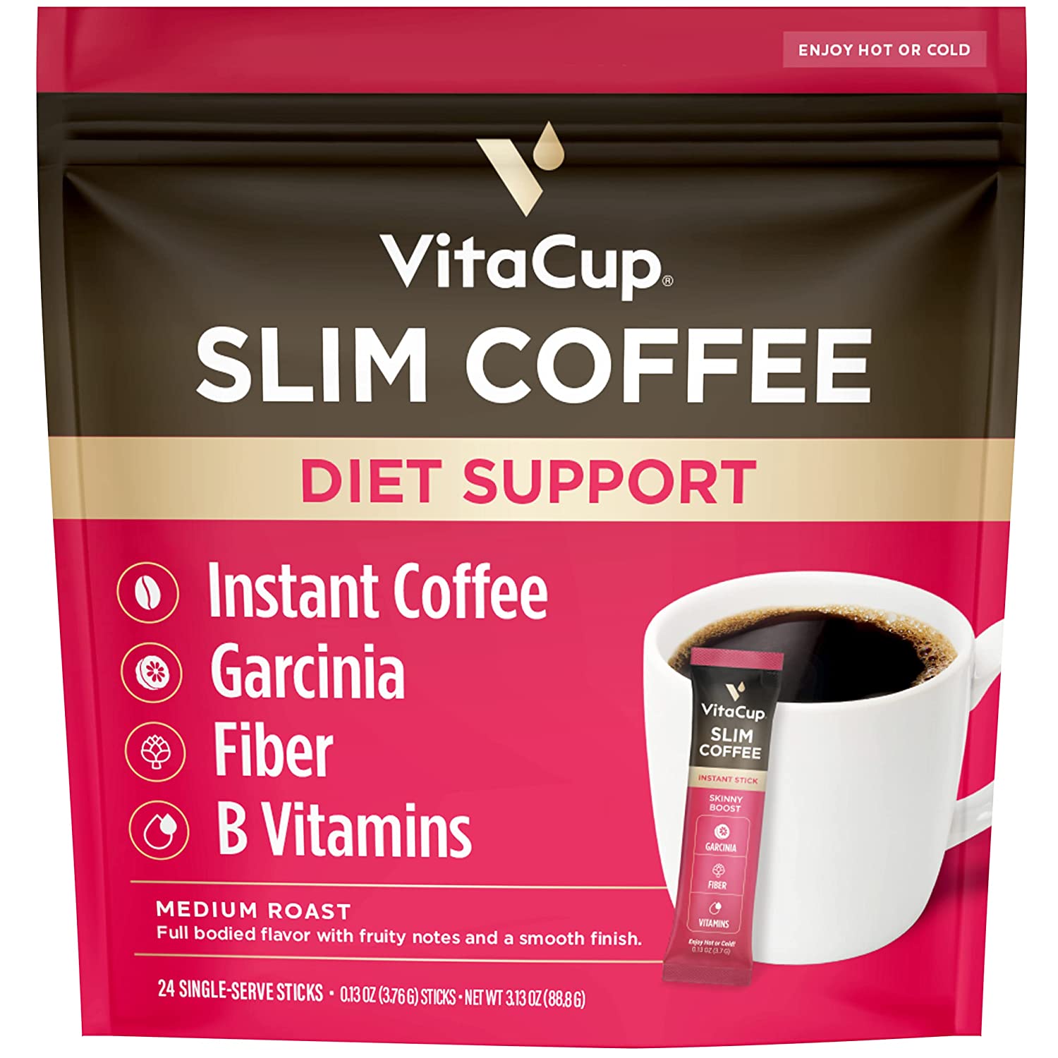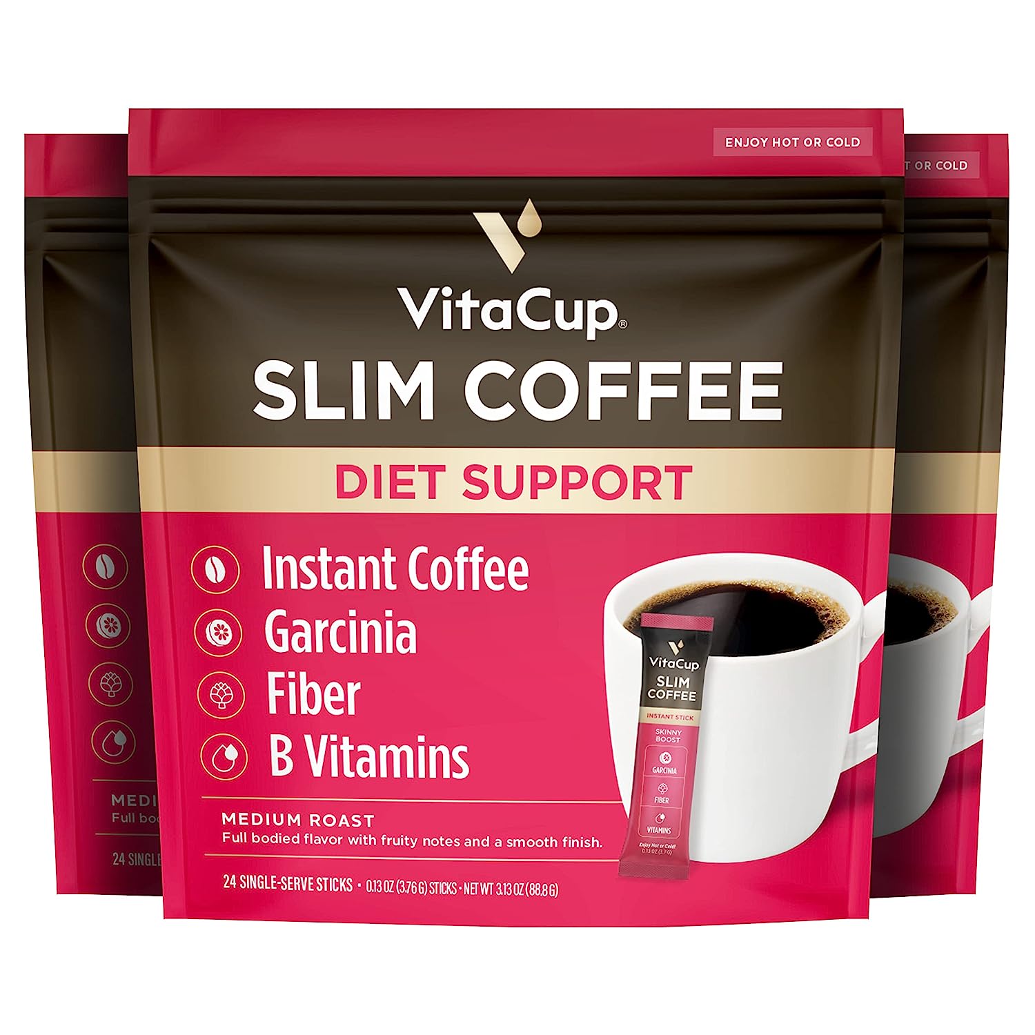 VitaCup Slim Instant Coffee Packets, with Fiber, Garcinia, B Vitamins, Bold & Smooth, Medium Dark Roast, 100% Arabica Coffee in Single Serve Sticks, 24 Ct