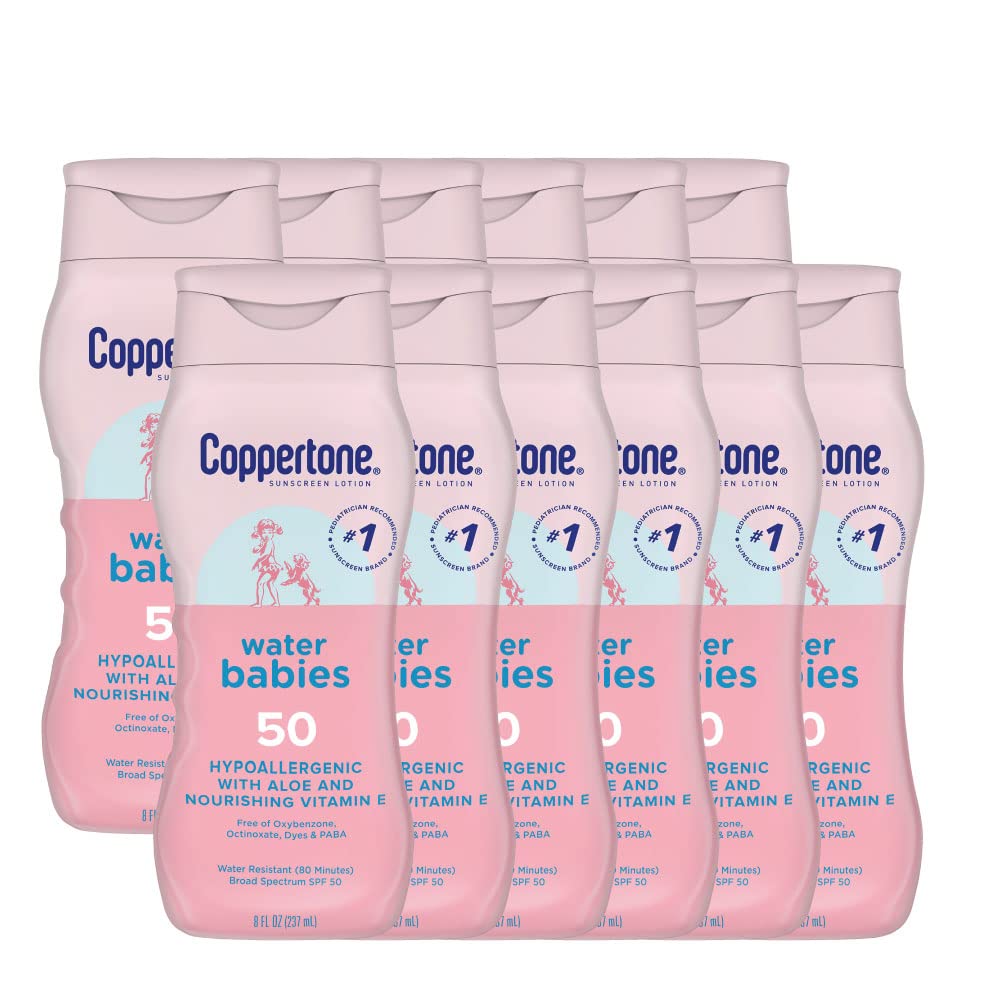 Playing outside is a lot more fun when your little ones are protected from the sun with Coppertone WaterBabies Baby Sunscreen Lotion. From the #1 pediatrician recommended sunscreen brand(2), this Coppertone sunscreen is hypoallergenic and gentle. This sunscreen lotion protects your baby's skin from the sun with a water resistant sunscreen (80 minutes) formula that's dermatologically tested and free of PABA, dyes, Octinoxate and Oxybenzone. This Coppertone sunscreen for babies delivers Broad Spectrum SPF 50 UVA/UVB protection, and the formula is gentle on baby's skin. Coppertone WaterBabies sunscreen protects baby's skin from up to 98% of the sun's most damaging UV rays. Apply Coppertone WaterBabies sunscreen SPF 50 lotion to your baby's skin whenever the fun takes you outside. Coppertone is voted the most trusted sunscreen brand(1) and each sunscreen Coppertone creates follows a tradition of trusted, quality sun protection products. Use and reapply Coppertone WaterBabies Sunscreen as directed. (1)Voted Most Trusted Sunscreen Brand by American Shoppers Based on the 2022 BrandSpark American Trust Study. (2)According to IQVIA, Provoice Survey From June 1, 2021 to May 31, 2022