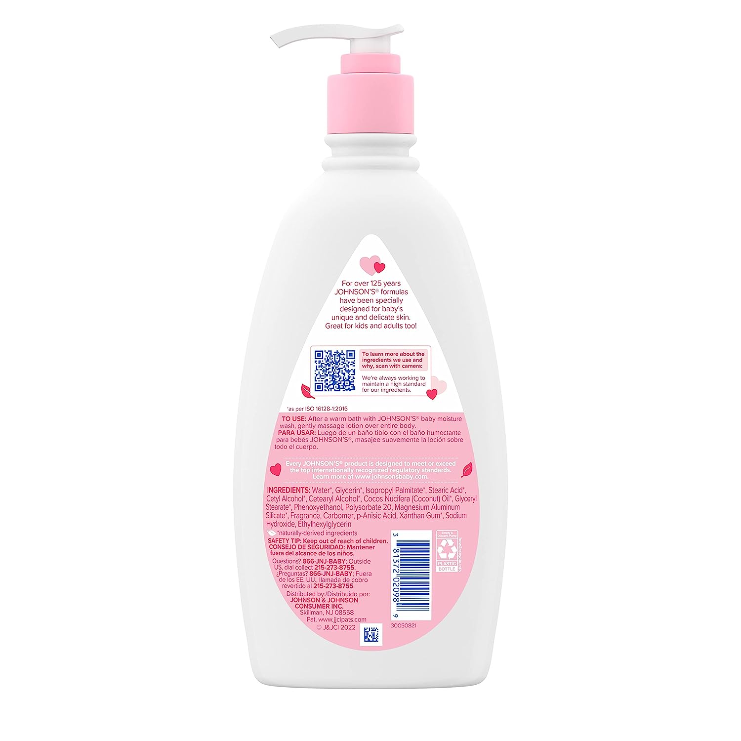 Nourish your little one's skin with Johnson's Pink Baby Lotion with coconut oil. Gentle enough for babies and suitable for the whole family, this pink baby lotion with the naturally derived ingredient coconut oil hydrates baby's dry, delicate skin. The lotion is specially formulated to moisturize to help maintain baby's healthy-looking skin. Dermatologist- and pediatrician-tested, the improved formula of this pink baby body lotion is designed with input from parents like you. It is hypoallergenic, free of parabens, phthalates and dyes and is 100% gentle and mild. Johnson's Baby Lotion can be used as part of a regular skin care routine by massaging into skin after a bath or any time baby has dry skin.