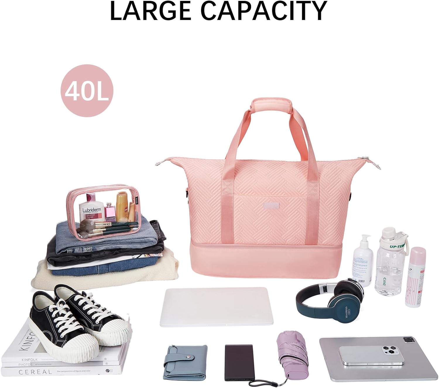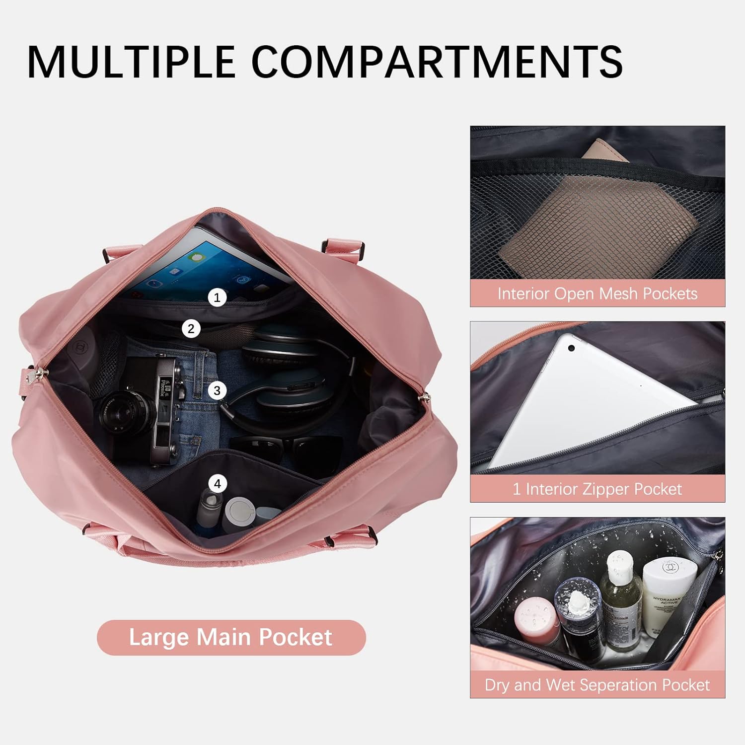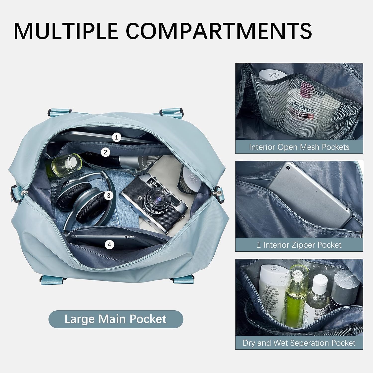 • ?Large Duffle Bag:Size :18.5x13x6.5 inch. Duffle Bag for women has Large capacity and multiple compartments. Large main pocket*1,Interior zipper pocket*1,zippered Dry and Wet seperation pocket *1,Interior Open mesh pockets*3 inside. Front open pocket*1,Back zipper pocket*1, Trolley Sleeve*1. Travel Duffle Bag contain your travel/Gym essentials easily and orderly.