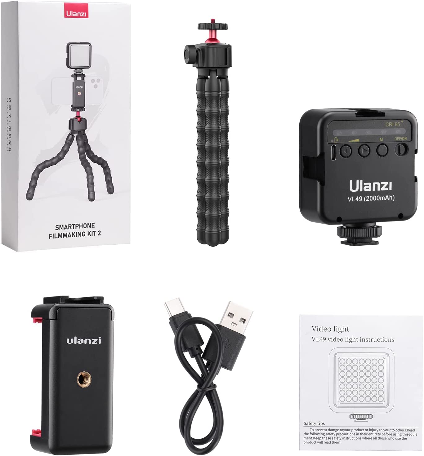 • Smartphone Youtube Equipment Package List --- 1*Selfie Stick Tripod 、1*Mobile phone holder with cold shoe、1*Video light、1*type-c charging cable.