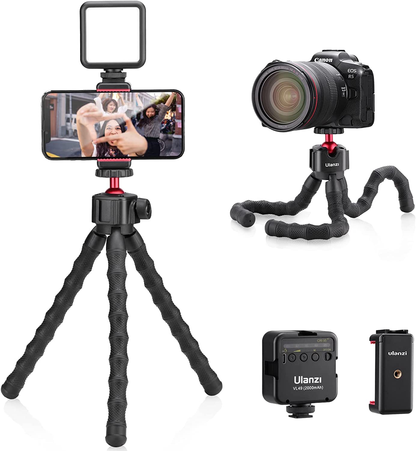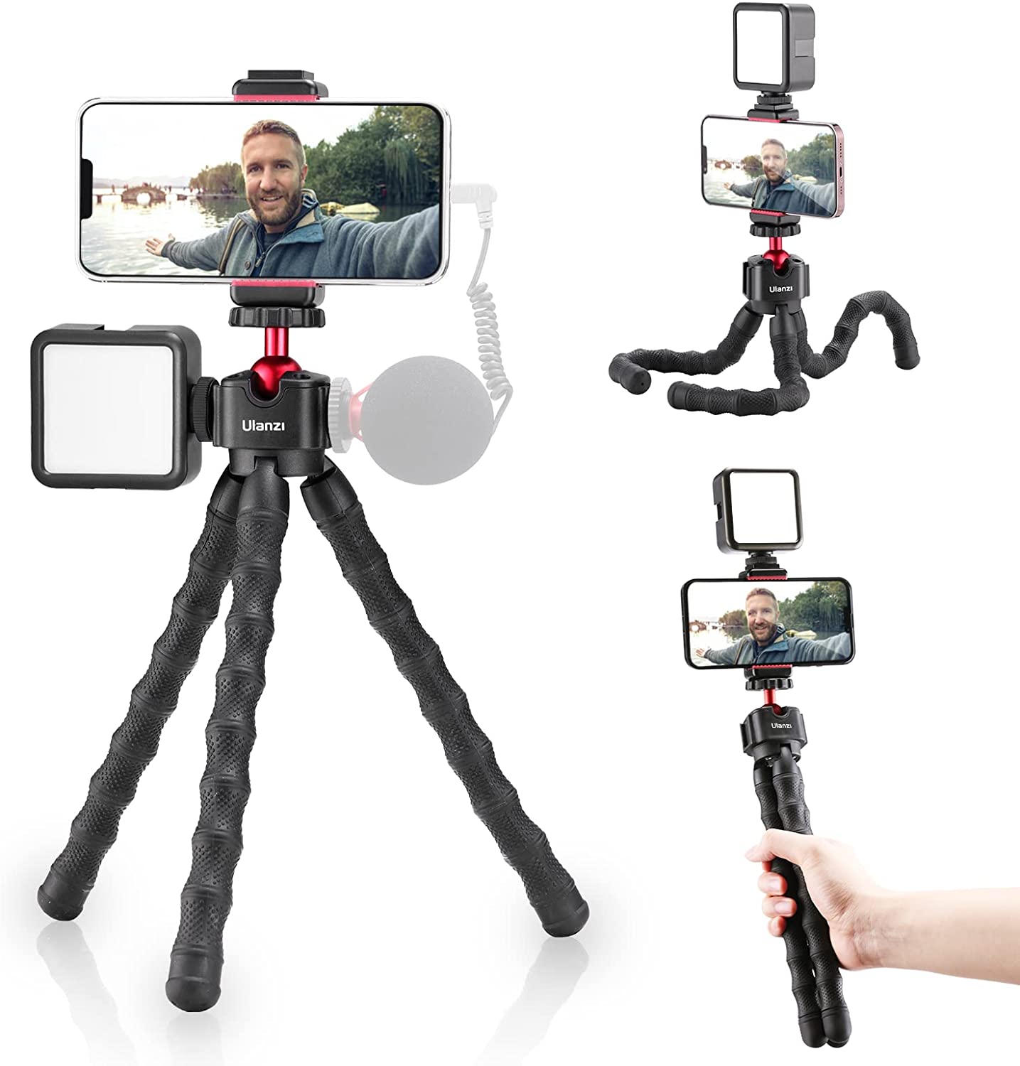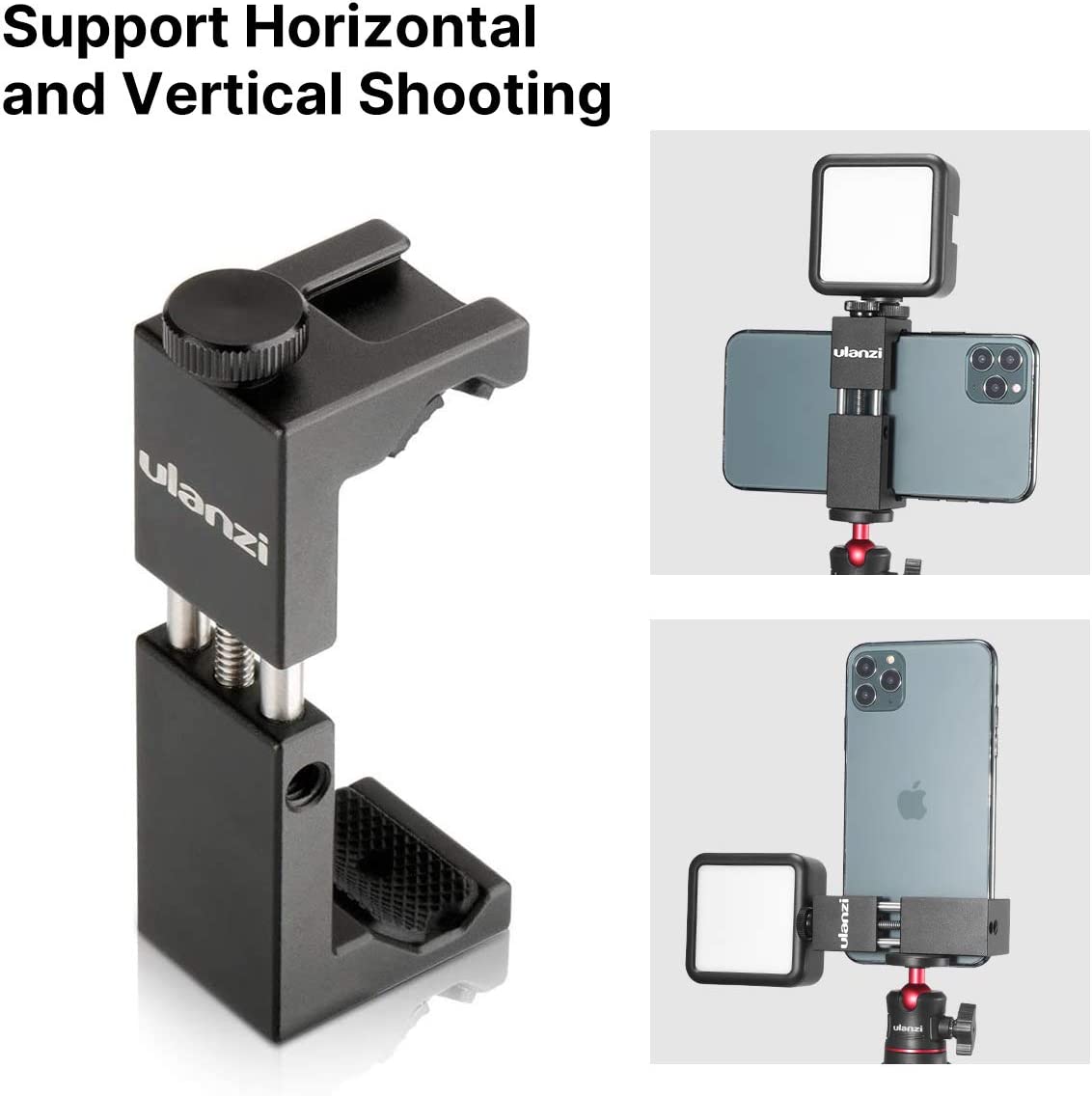 • Phone Holder---------phone holder support horizontal or vertical shooting and has a cold shoe, which can expand the video light/microphone. The width of the phone is 2.6 in---3.7 in. It is compatible with iPhone12/ 11/11 Pro/11 Pro Max/XS Max/8 Plus/for Samsung Galaxy/Google Pixel.