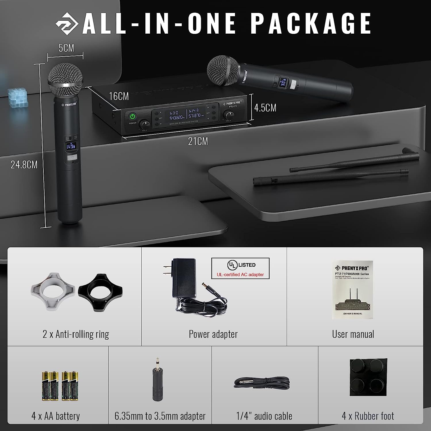 • BOX CONTENTS: 1 x channel wireless metal receiver for long operation, 2 x UHF handheld microphone wireless,1 x 1/4’’ audio cable, 1 x power adapter, 2 x antenna, 2 x anti-rolling rings, 4 x AA battery for 16hrs long hour use, 1 x user manual
