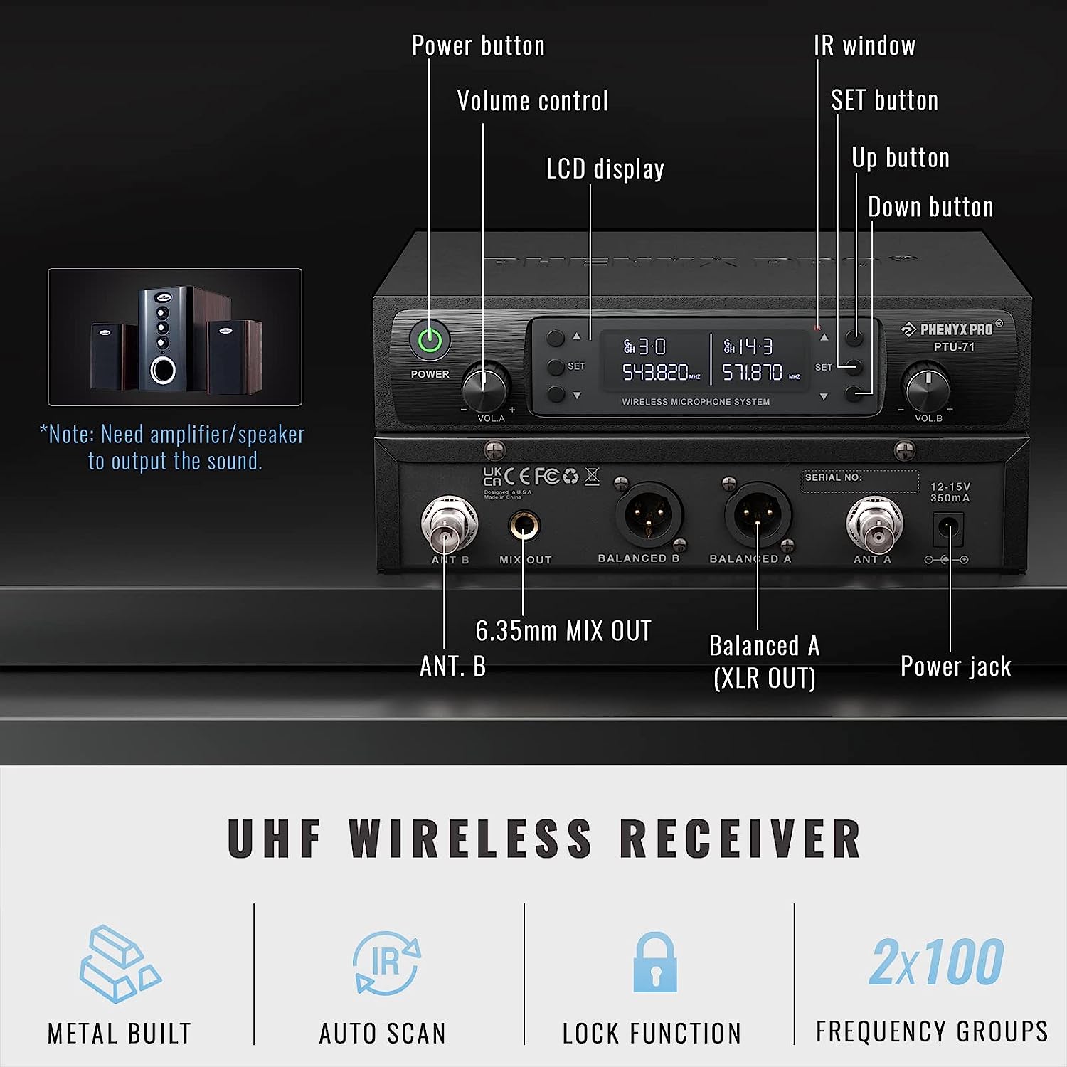 Phenyx Pro Wireless Microphone System, Dual Wireless Mics, w/ 2 Handheld Dynamic Microphones, 2x100 Adjustable UHF Channels, Auto Scan, 328ft Range, Microphone for Singing, Karaoke, Church (PTU-71A)