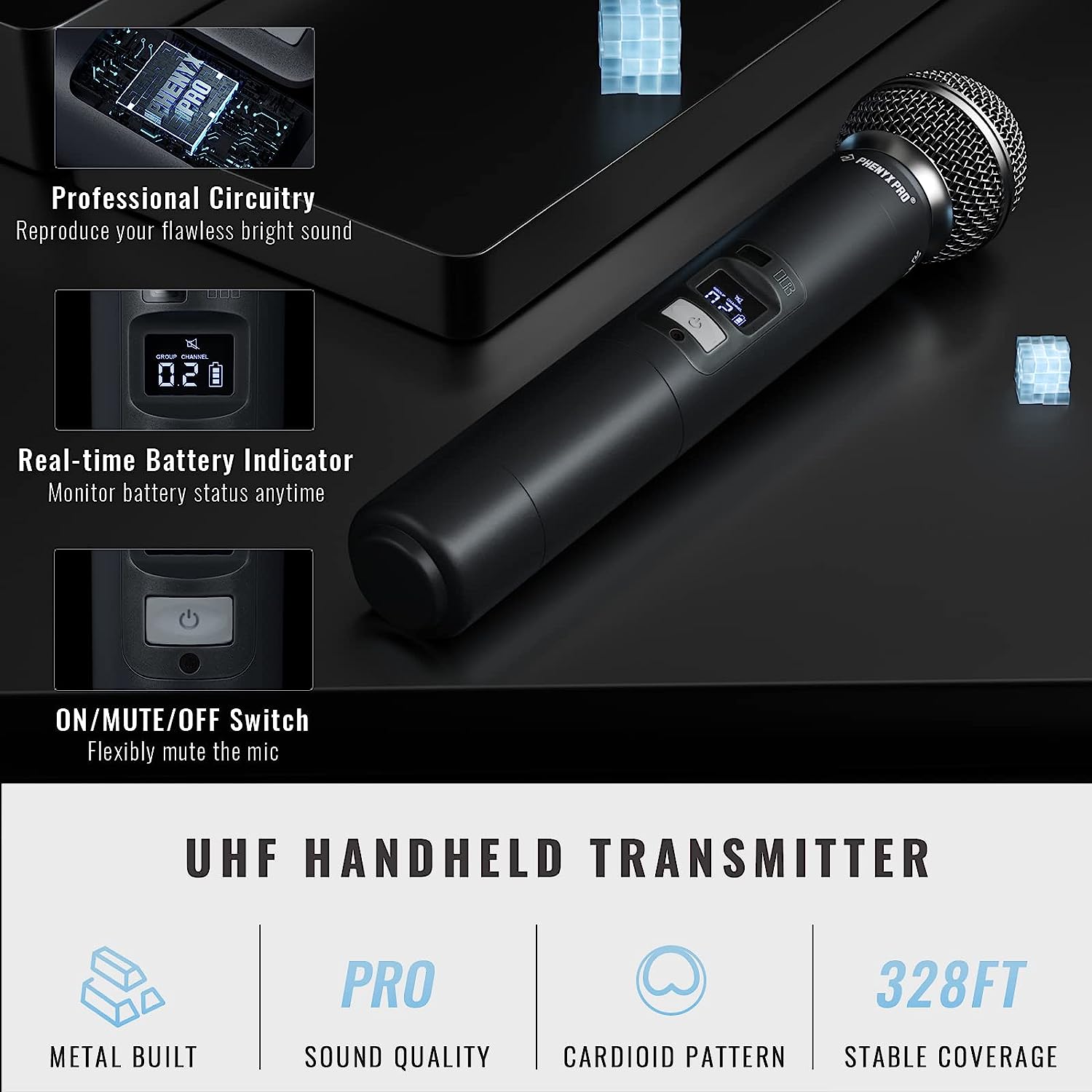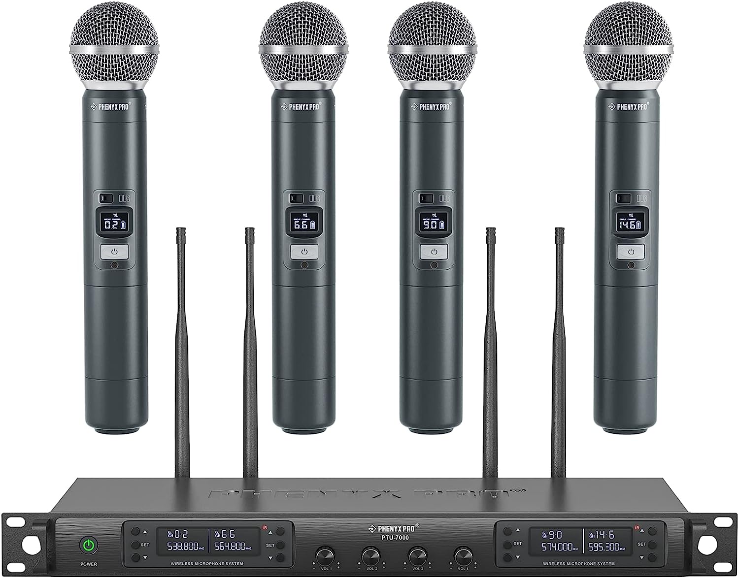 Phenyx Pro Wireless Microphone System, Quad Channel Wireless Mic, w/ 4 Handheld Dynamic Microphones, 4x40 Channels, Auto Scan, Long Distance 328ft, Microphone for Singing, Church, Karaoke (PTU-7000A)