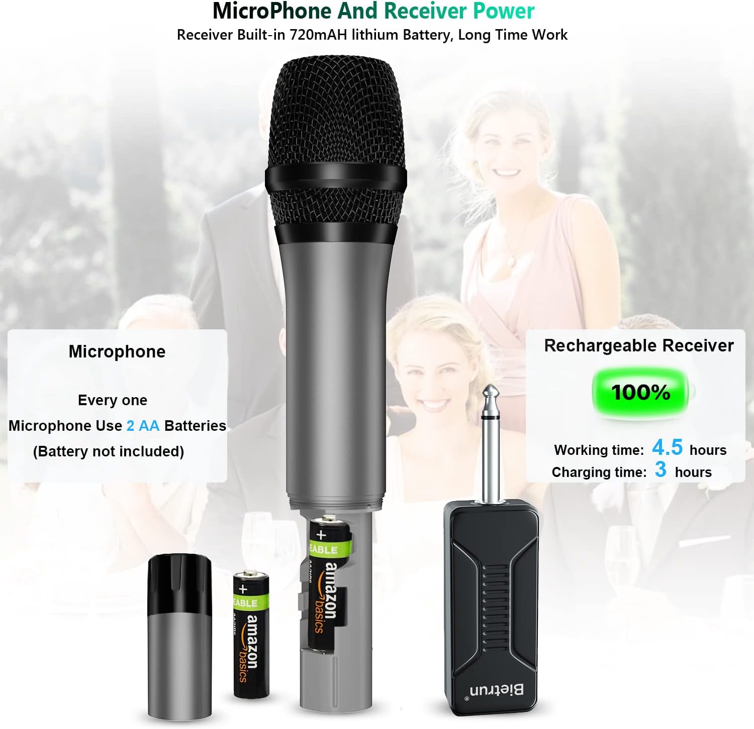 • Microphone Battery Powered and Rechargeable Receiver: The Microphone Does Not Come With Any Batteries, We Recommend Using 2 AA Amazon Alkaline Batteries. ●Correctly install the battery + - direction.●the receiver should be charged for 5 hours before the first use●Long Press and hold the Mic and Receiver buttons to power on, The Chargeable Receiver Is Built-In 650 Mah Battery For 4 Hours work Time And Fully Charged In 3 Hours.