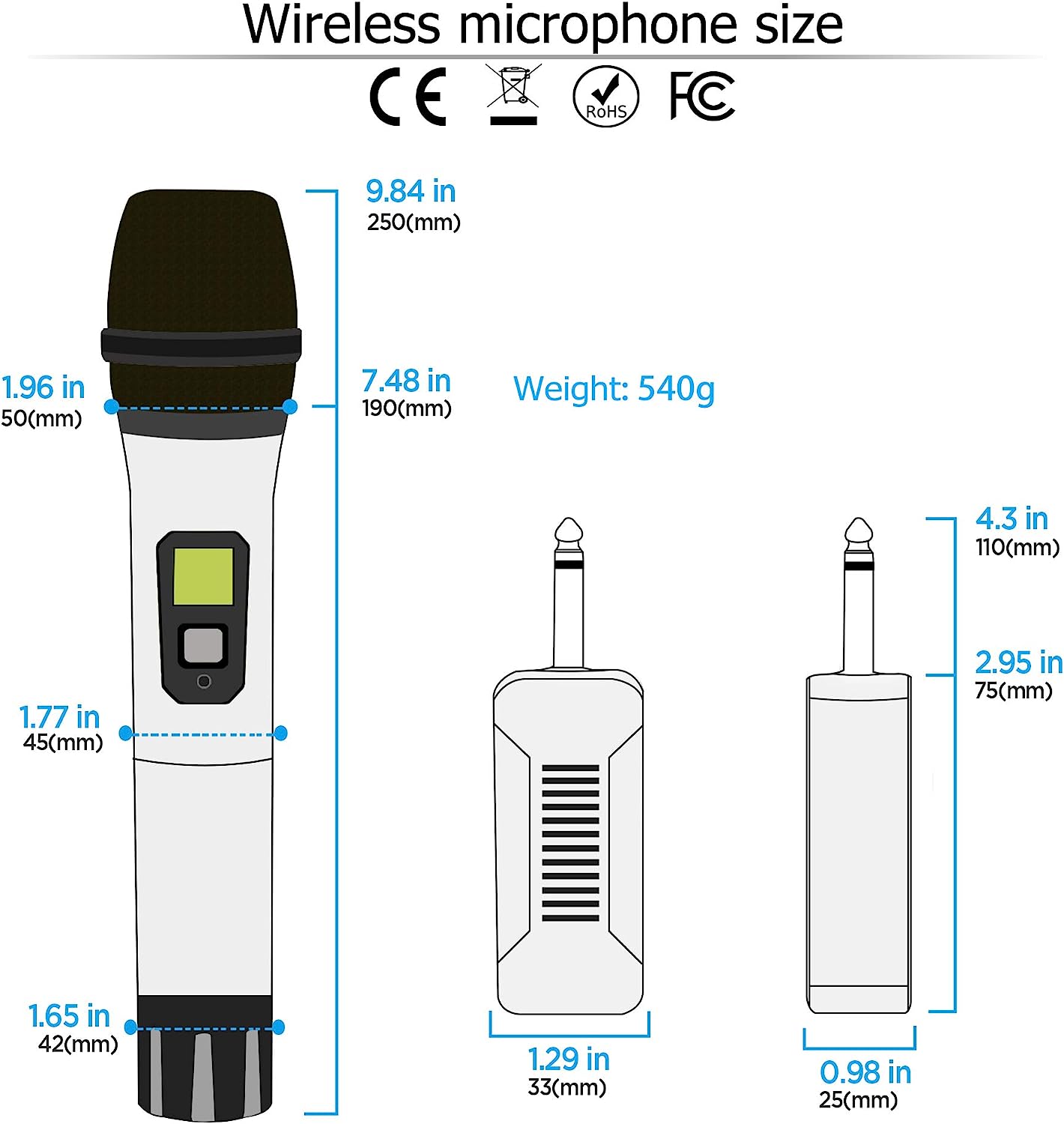 • Plug And Play, Easy To Use: ●Can Only Plug In equipment with Mic input, Can't Plug In AUX input, Otherwise No Sound.(Not Compatible with Bluetooth Speakers and Laptop)●For With Mic input Speaker, Singing Machine, Audio Amplifier, Pa System, Mixer, Voice Amplifier And More Streaming Multimedia Equipment..●The Display Can Show The Battery Power And Signal Strength In Real Time, Don'T Worry About Suddenly Not Working.