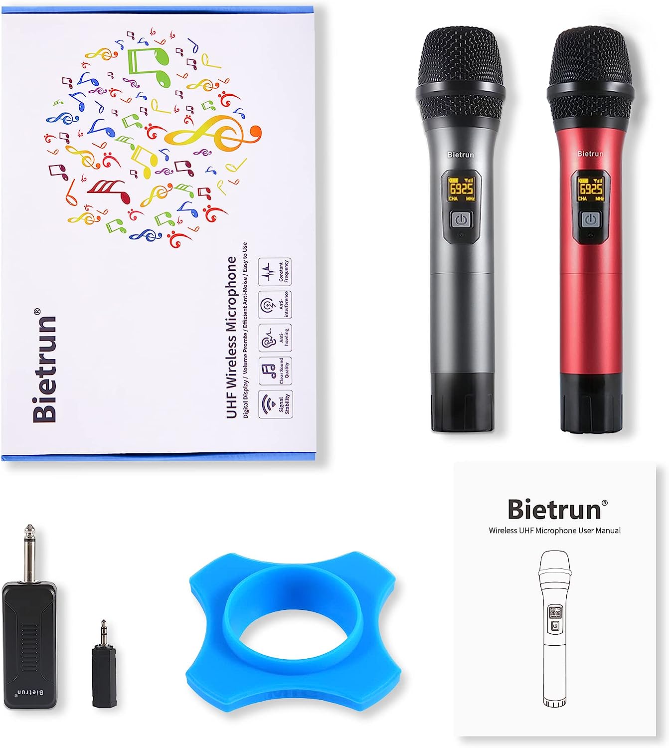 Wireless Microphone, Bietrun UHF Metal Dual Handheld Cordless Dynamic Mic System with Rechargeable Receiver, 1/4‘’Output, for Karaoke, Church, Speech, Wedding, Party Singing(160 ft Range)-Auto Connect