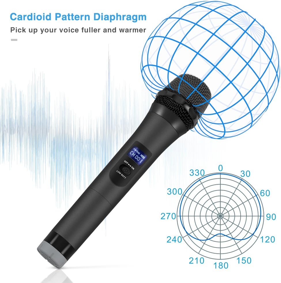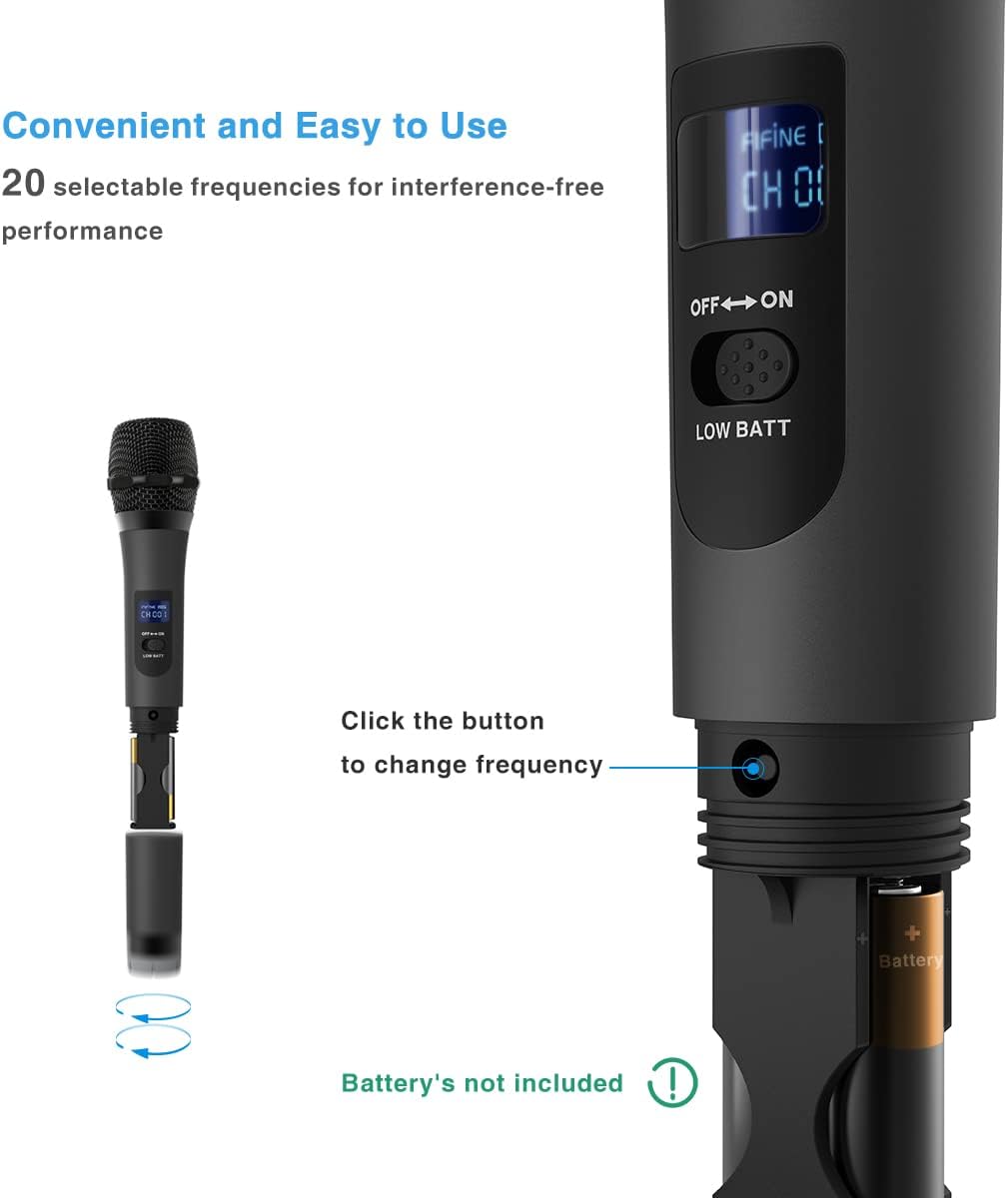 • Convenient and Easy to Use--Plug and play. 20 selectable frequencies for interference-free performance. Low-battery warning indicators on receiver and microphone, enables constant monitoring of system operation. Comfortable and easy to hold singing microphone, great for karaoke nights and smaller house parties to have some fun over the speakers.
