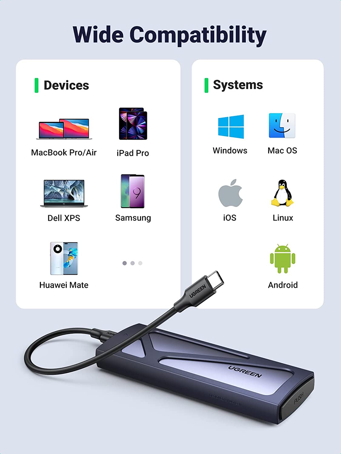 • Broad Compatibility: The UGREEN M.2 NVMe SSD enclosure is specially designed for M and B&M Keys and for 2230/ 2242/ 2260/2280 sized SSDs Max 8TB. The M.2 NVMe enclosure is applicable to Windows, Mac OS, Linux, Android, IOS systems.