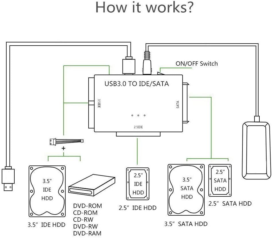 • 【Wide Compatibility】 Hard drive to USB adapter support Operate Systems: Support Windows XP/Vista/7/ 8/8.1/10, Mac OS 10 or higher, Linux. Compact body design, Support Plug, and play & hot swap, On/Off power Switch for Hard drives protection.