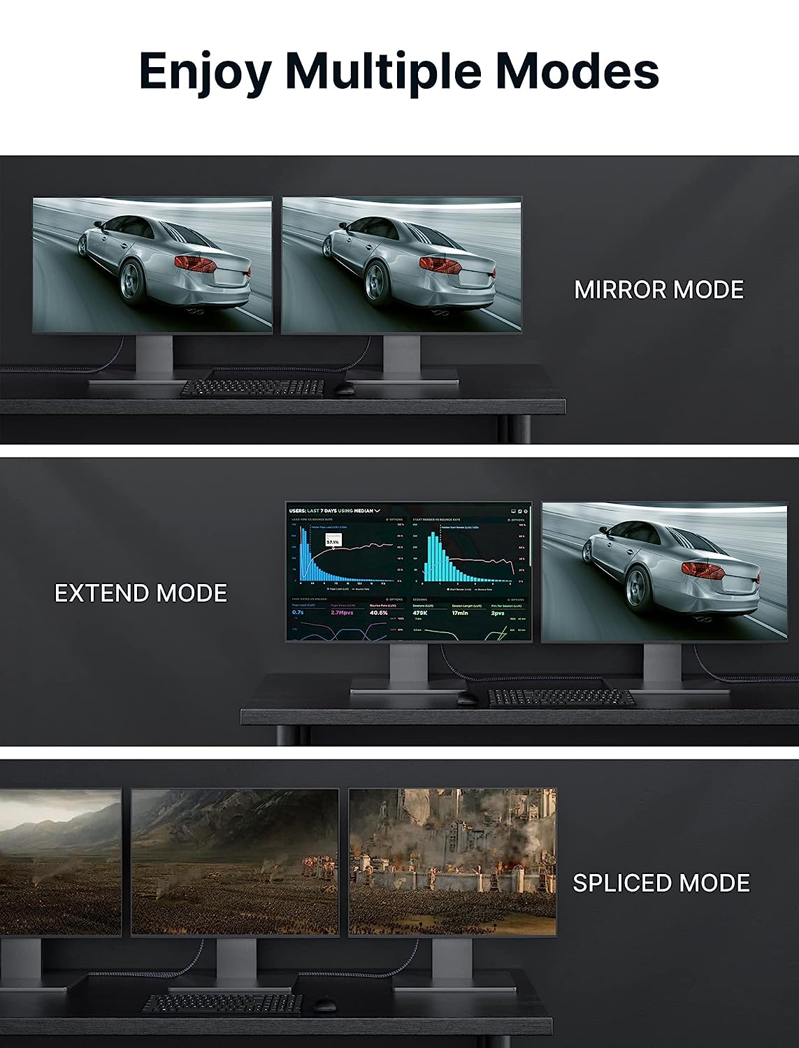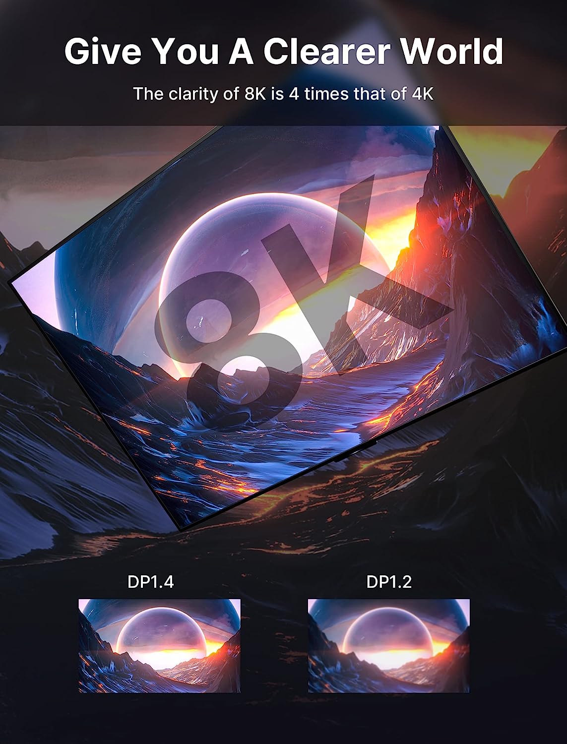 • 【8K Displayport Cable】Displayport 1.4 cable supports high resolutions, such as 8K(7680x4320)@60Hz, 5K(5120x2880)@60Hz, 4K@144Hz, 2K@240Hz, 1080P@240Hz. It also support Dynamic HDR and HDCP 2.2. High resolution make the picture is more clear. Dynamic HDR makes the color level of the picture richer and more realistic. Displayport 1.4 cable can bring you a visual enjoyment.