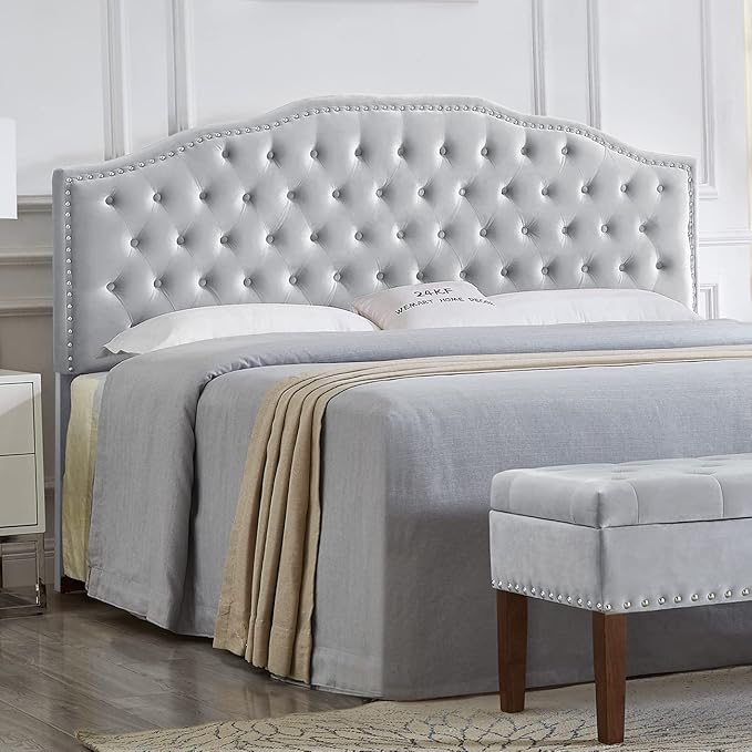 24KF Upholstered Button Tufted King Size Headboard with Nailhead Trim, Soft Velvet Fabric Headboard King/CA King Size Headboard-Gray