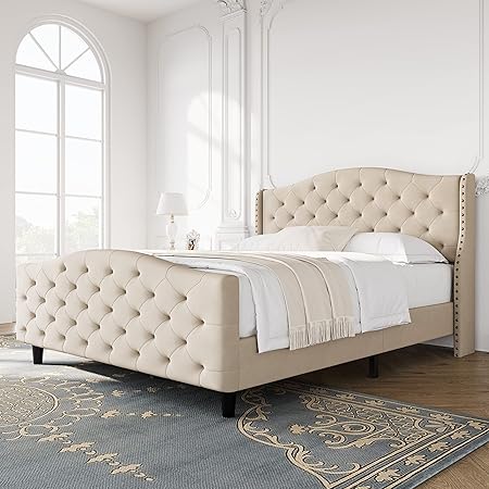 GAOMON Queen Size Velvet Bed Frame with Headboard and Footboard, Tufted Wingback Headboard, Upholstered Platform Bed, Strong Wooden Slats, No Box Spring Needed, Easy Assembly (Beige, Queen)