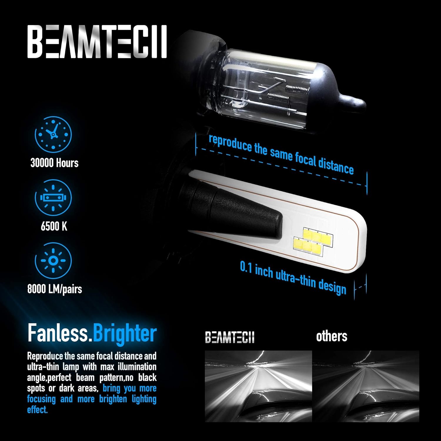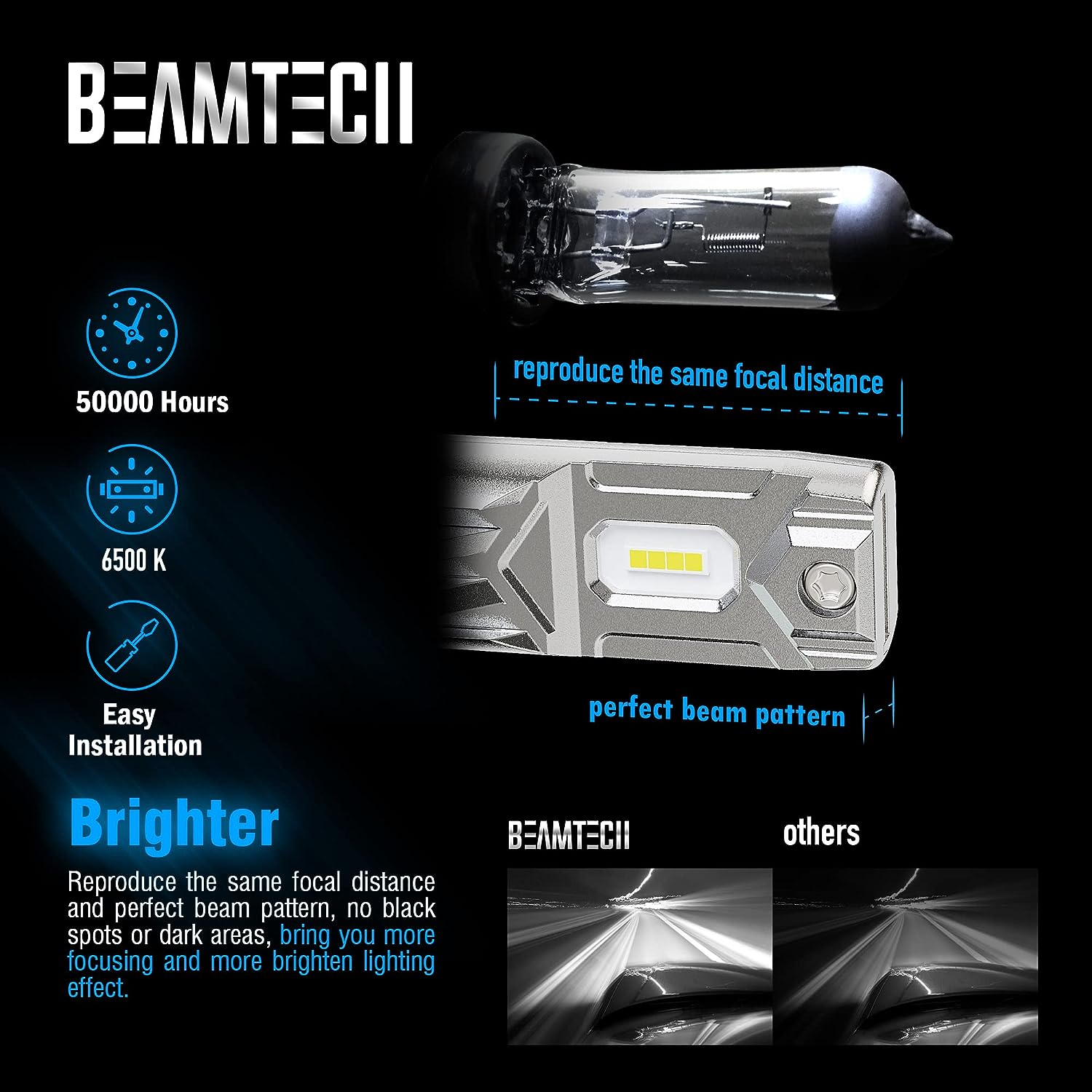• Good Light Pattern:Reproduce the same focal distance as the halogen lamp.Without any dark spots or foggy light.Bring you more focusing and brighten lighting effect.Safer night driving.