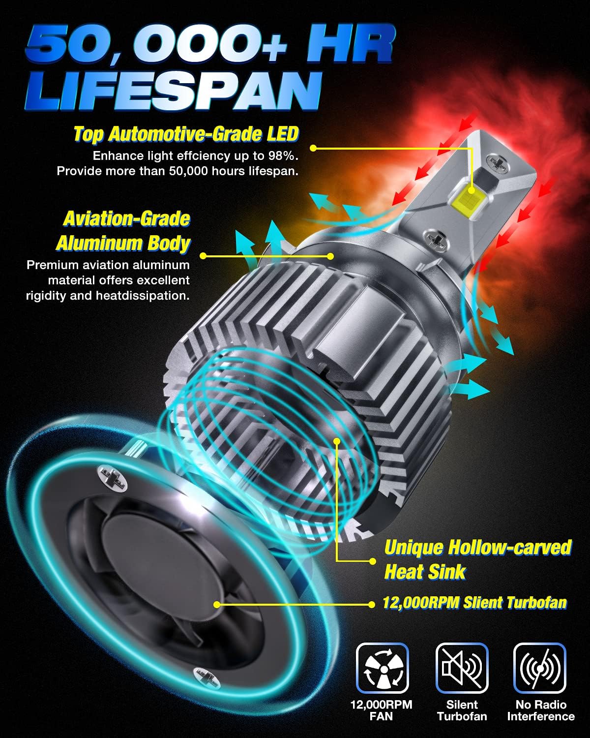 • 【Over 50,000 Hours Lifespan】 Whole aviation aluminum body, unique hollow-carved heat sink design and 1,2000RPM turbo cool fan provide super cooling ability, which ensures a longer lifespan up to 50,000 hours.
