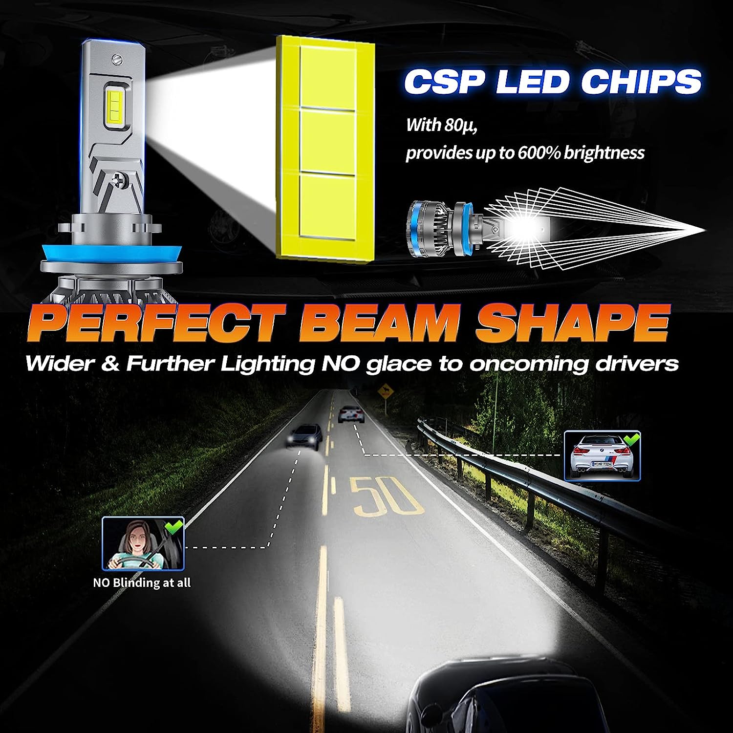 • PERFECT BEAM PATTERN: The ultra-thin design makes the chips of our 9005/HB3 led bulb much closer for a Super-Focused beam, delivering wider angle and farther range light on the road. No glare to oncoming traffic, and no dark spots ensure a safer drive.