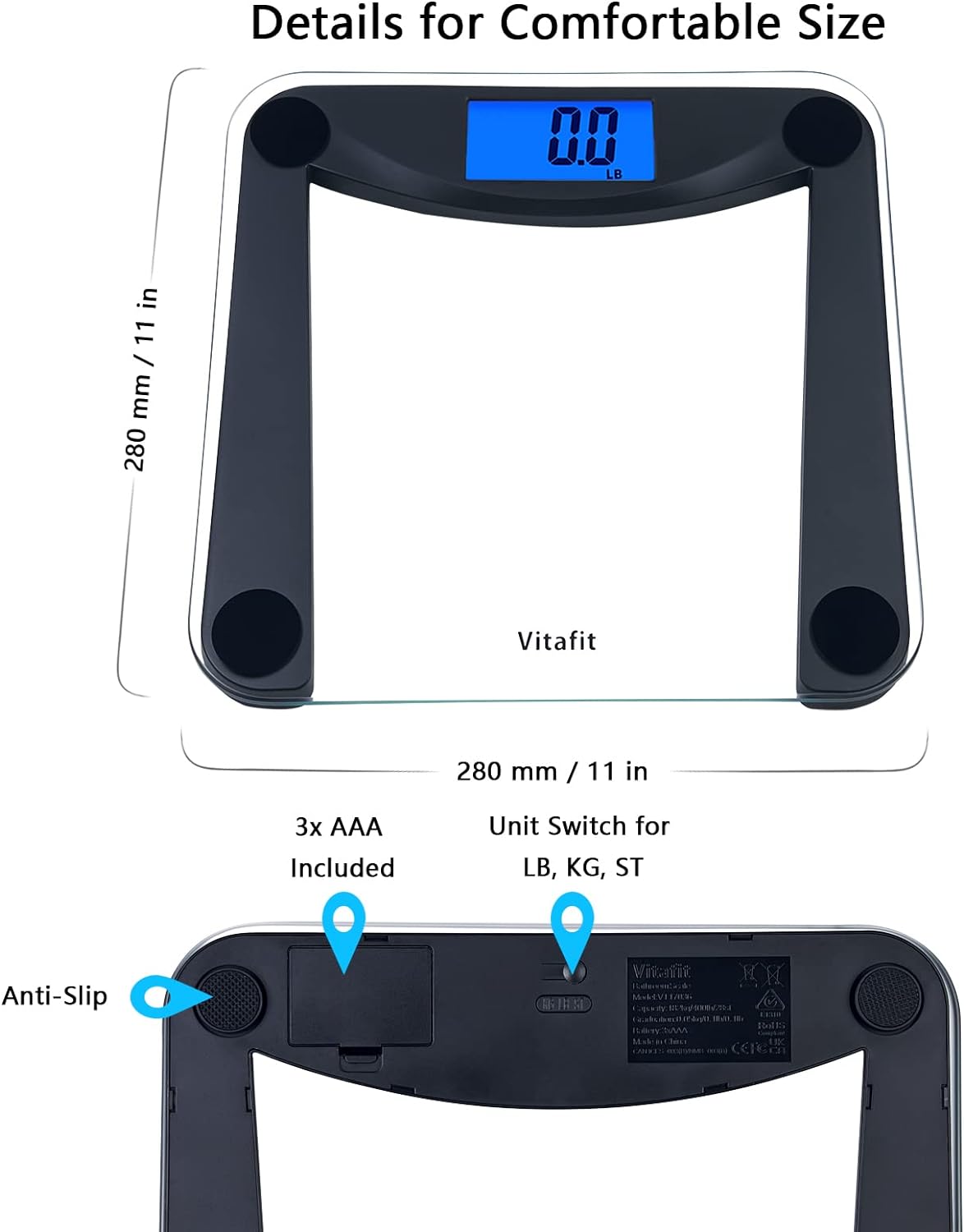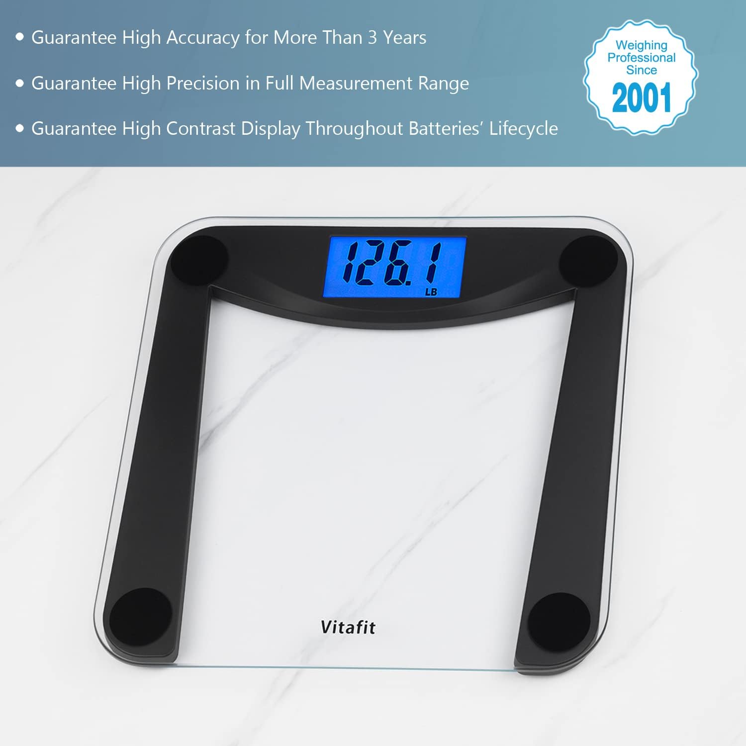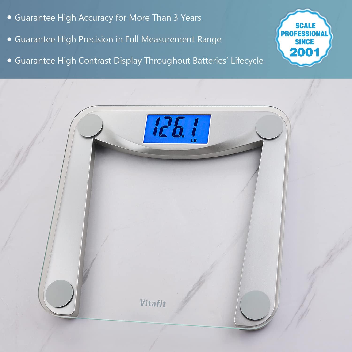 Vitafit Digital Bathroom Scale for Body Weight,Weighing Professional Since 2001,Extra Large Blue Backlit LCD and Step-On, Batteries Included, 400lb/180kg,Clear Glass,Silver