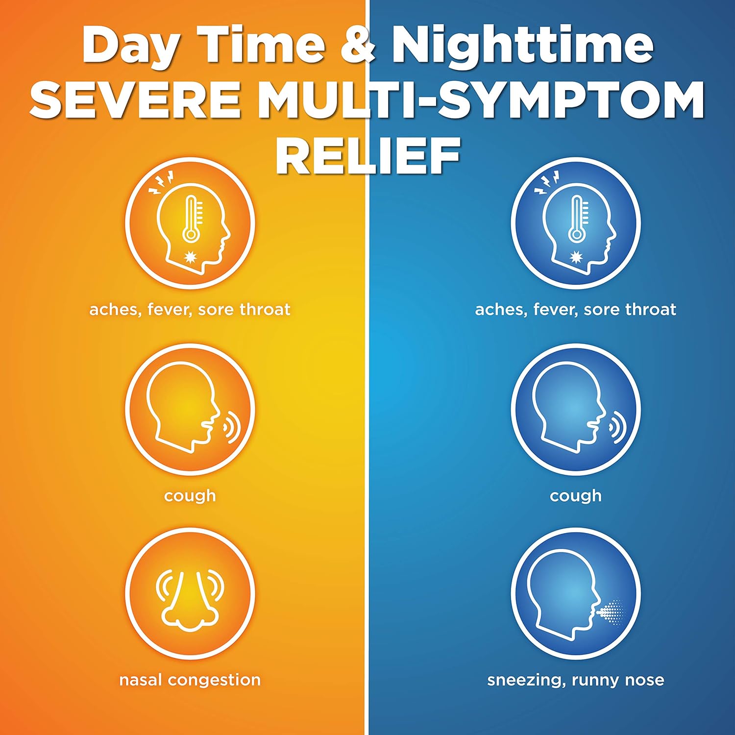 • EFFECTIVE: Daytime relieves minor aches and pains, fever, nasal congestion, sinus pressure, cough and chest congestion; Nighttime relieves minor aches and pains, fever, nasal congestion, sinus pressure, sneezing, runny nose and cough