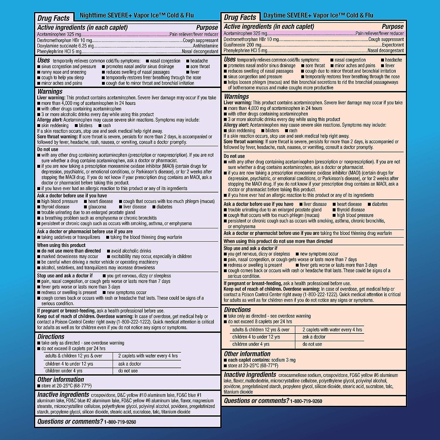 Compare to Vicks DayQuil and NyQuil Severe VapoCOOL active ingredients. Combat cold and flu symptoms with Amazon Basic Care Vapor Ice Daytime and Nighttime Severe Cold and Flu, Coated Caplets. This combo pack gives you around-the-clock, maximum strength relief of multiple cold and flu symptoms. Non-drowsy Daytime relieves minor aches and pains, fever, nasal congestion, sinus pressure, cough and chest congestion. Nighttime relieves minor aches and pains, fever, nasal congestion, sinus pressure, sneezing, runny nose and cough. Take these gluten free caplets for multi-symptom severe cold and flu relief. This product is for adults and children 12 years and over.