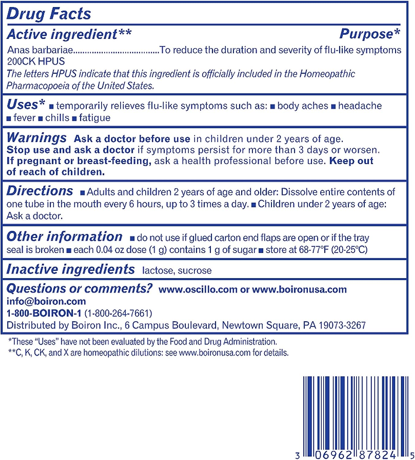 The moment you feel achy or rundown, nip flu-like symptoms in the bud with Boiron Oscillococcinum. Clinical studies show that Oscillococcinum reduces the duration and severity of flu symptoms such as body aches, headache, fever, chills, and fatigue. These uses have not been evaluated by the Food and Drug Administration.