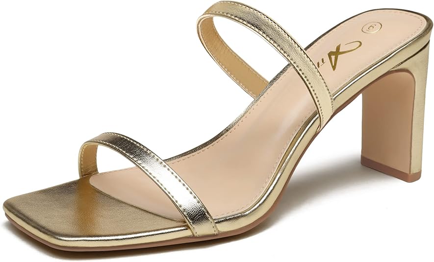 Athlefit Women's Square Open Toe Heeled Sandals Two Strap Slip On Backless Chunky Heels