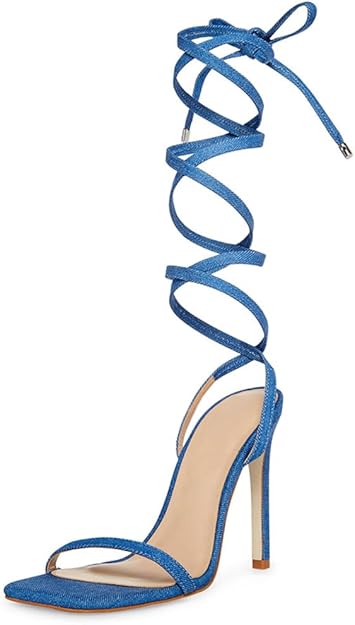 Yolkomo Denim Heels for Women Sexy Square Toe Lace Up Sandals