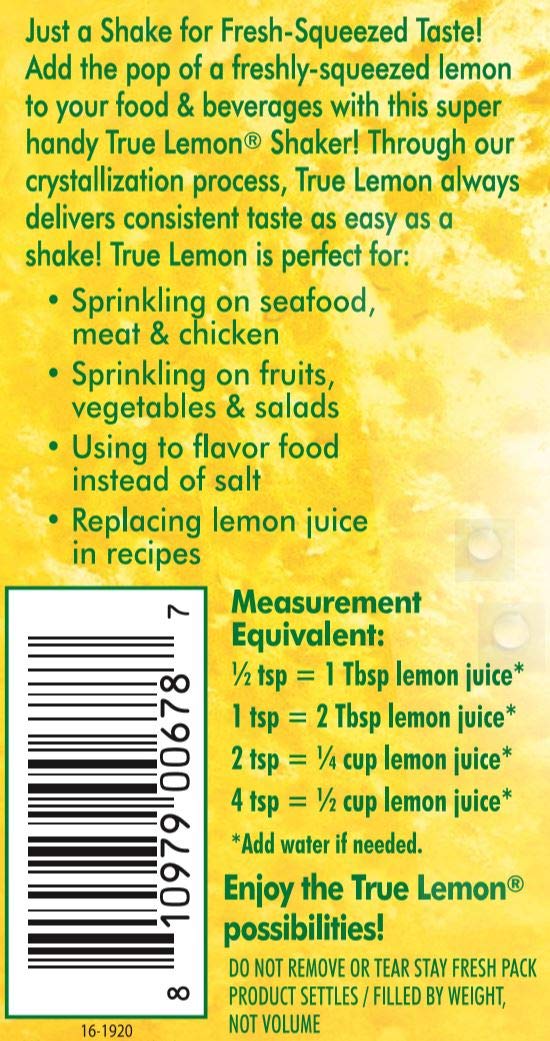 Sprinkling on seafood meat and chicken; Sprinkling on fruits vegetables and salads; Using to flavor food instead of salt; Replacing lemon juice in recipes; Made from lemons; 100% natural ingredients with no artificial colors, sweeteners or preservatives; Salt-free; Great for cooking, baking and seasoning