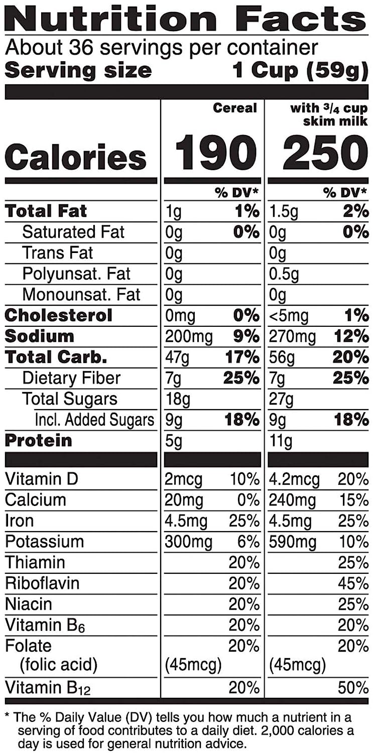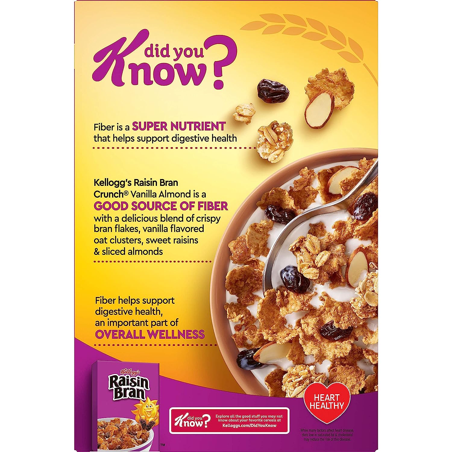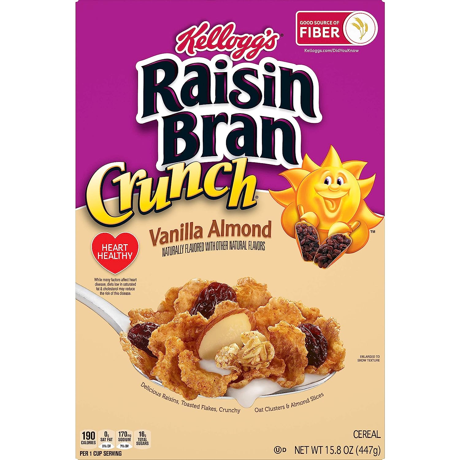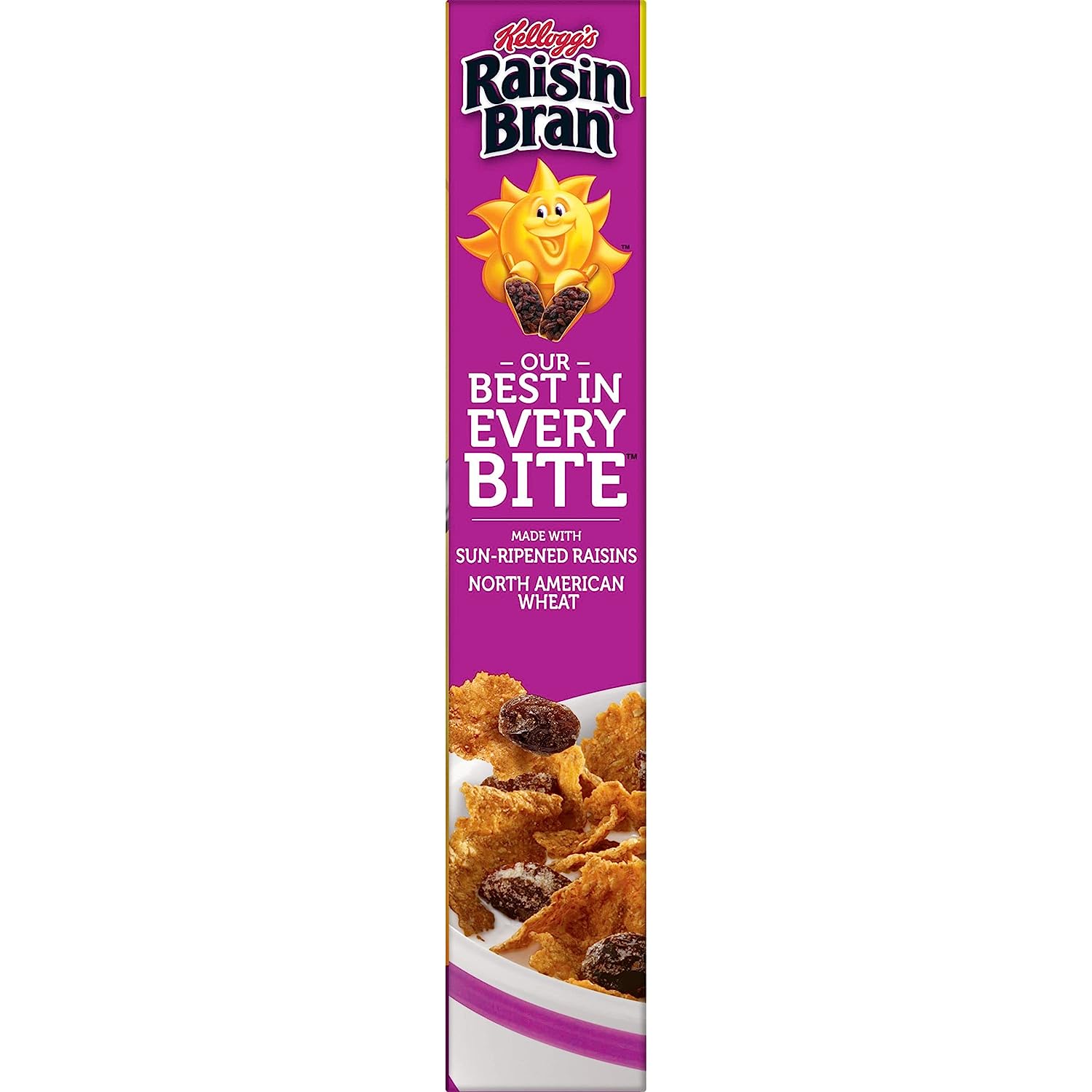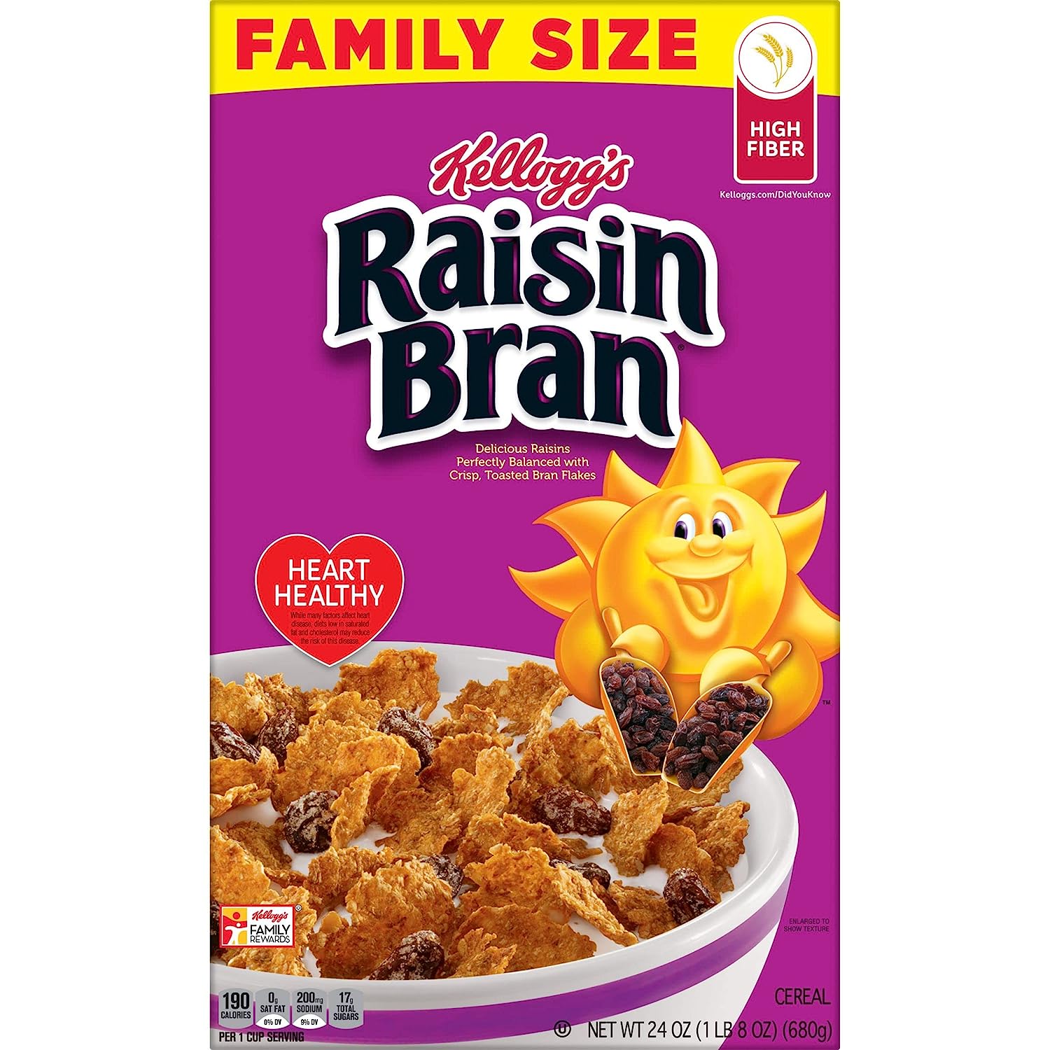 Wake up with Sunny and the simple goodness of Kellogg's Raisin Bran—a deliciously crafted, wholesome cereal that helps energize the start of your day. This healthy cereal is made with crispy, toasted bran flakes balanced with the satisfying taste of sweet raisins. Just as nutritious as it is delicious, this heart-healthy* breakfast cereal is low fat and contains an excellent source of fiber and essential vitamins and minerals to help you start your day off strong. Whether you enjoy your Raisin Bran in a bowlful at breakfast time, as an afternoon snack, or straight from the box after your workout, Kellogg's Raisin Bran Cereal lets you rise, shine and make the most of your day. * While many factors affect heart disease, diets low in saturated fat and cholesterol may reduce the risk of heart disease.