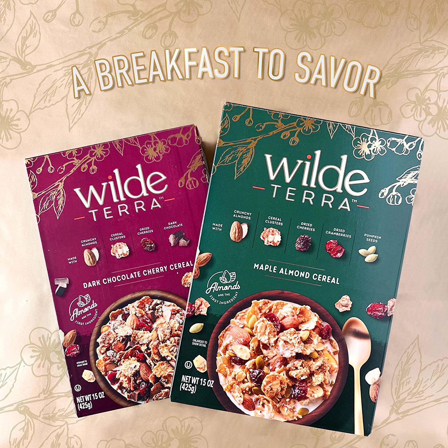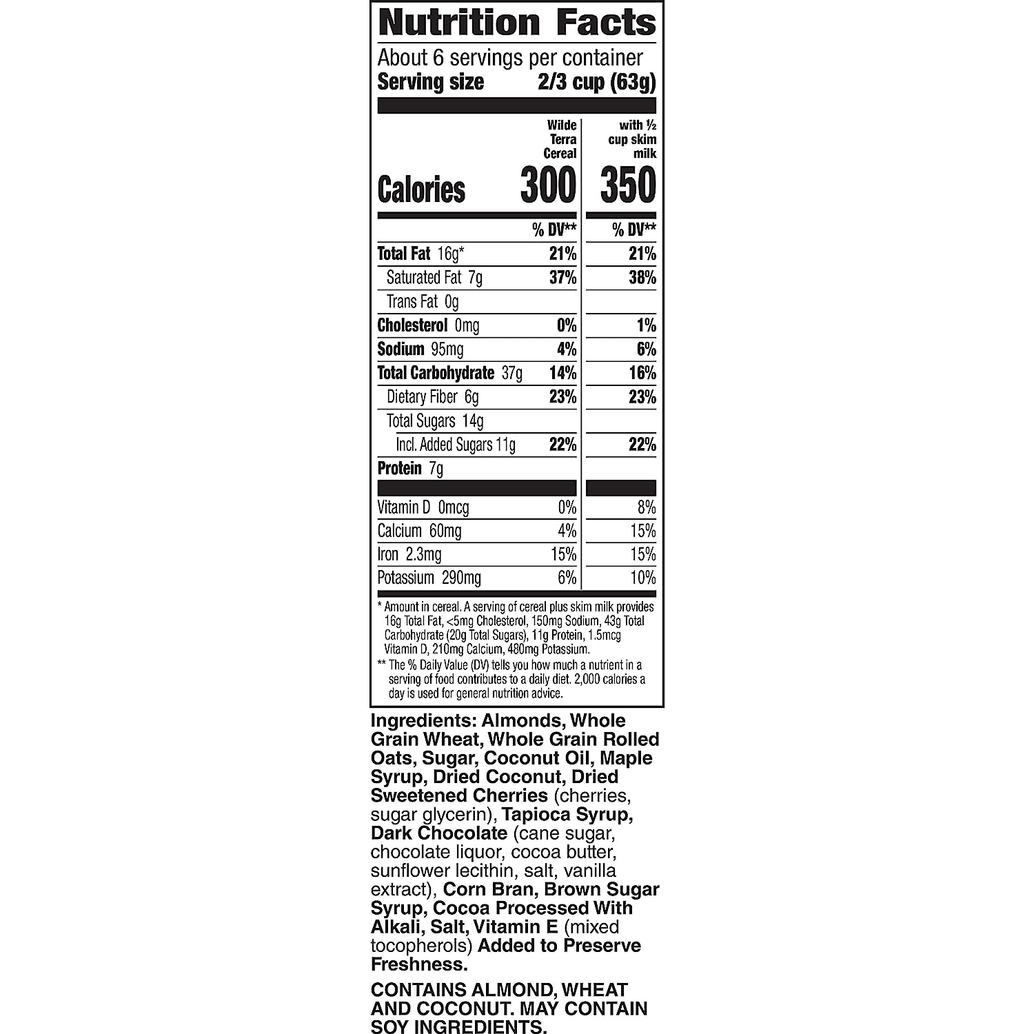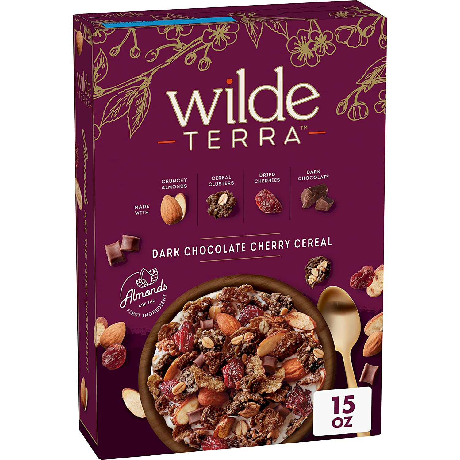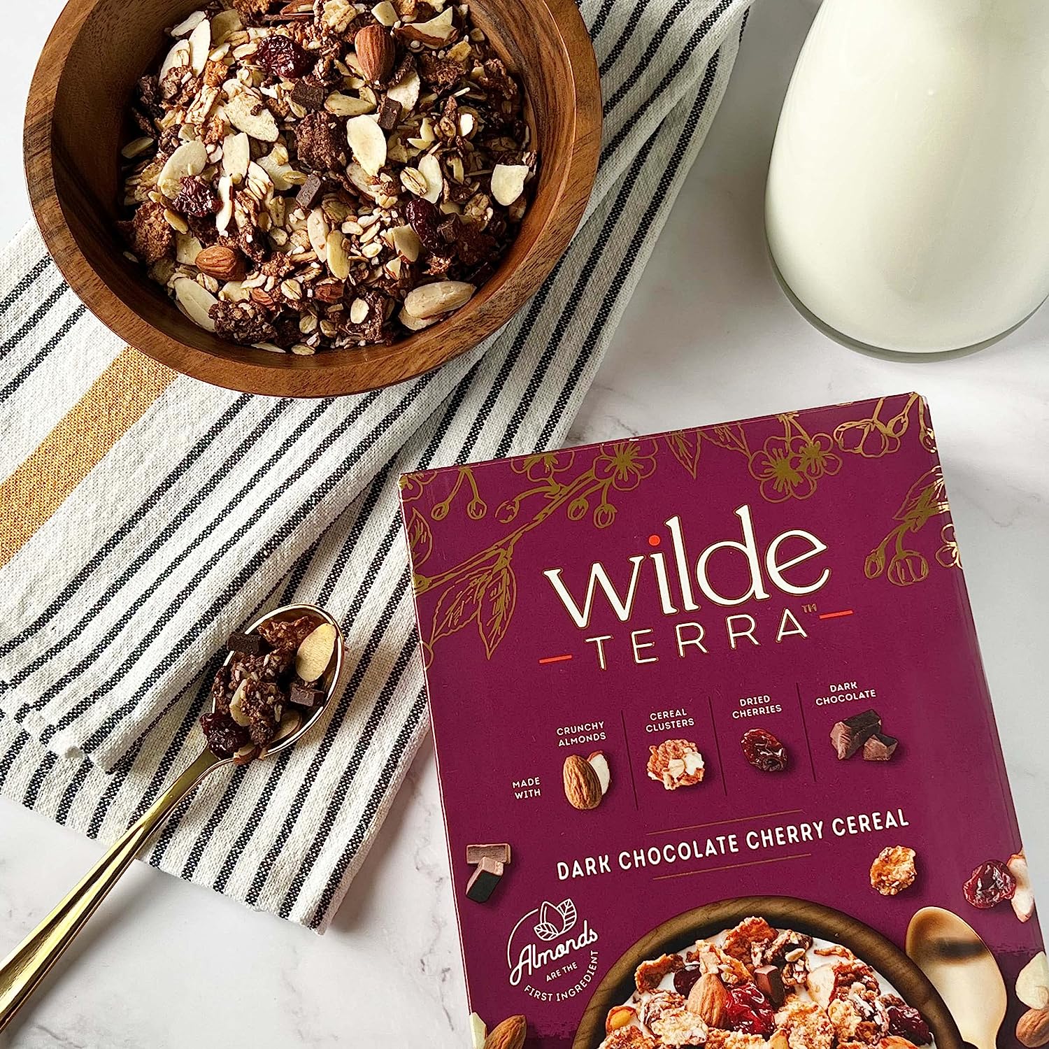Begin a new day with Wilde Terra Dark Chocolate Cherry Cereal with High Fiber. This breakfast cereal starts with almonds because they are that good. We next add cereal flakes with crunchy cereal clusters for a tasty crunch. A blend of dried cherries and dried coconut provides delicious flavor. Wilde Terra's recipe is more than a wholesome part of breakfast–it's the perfect harmony of taste and hearty goodness. Fill your breakfast cereal bowl with this delicious medley to carry you through your morning. Or pack a bagful for an afternoon snack of fruit and nut mix with cereal flakes. Real ingredients like seeds and nuts help satisfy you. Plus, every serving of this high fiber food is a source of iron and provides 15 grams of whole grains (at least 48 grams recommended daily). This cereal is carefully crafted for quality. Almonds are the first ingredient. Store this cereal in your cupboard as a delicious part of breakfast or a wholesome snack. A recipe with high quality, wholesome ingredients—that's what makes Wilde Terra cereal a breakfast to savor.