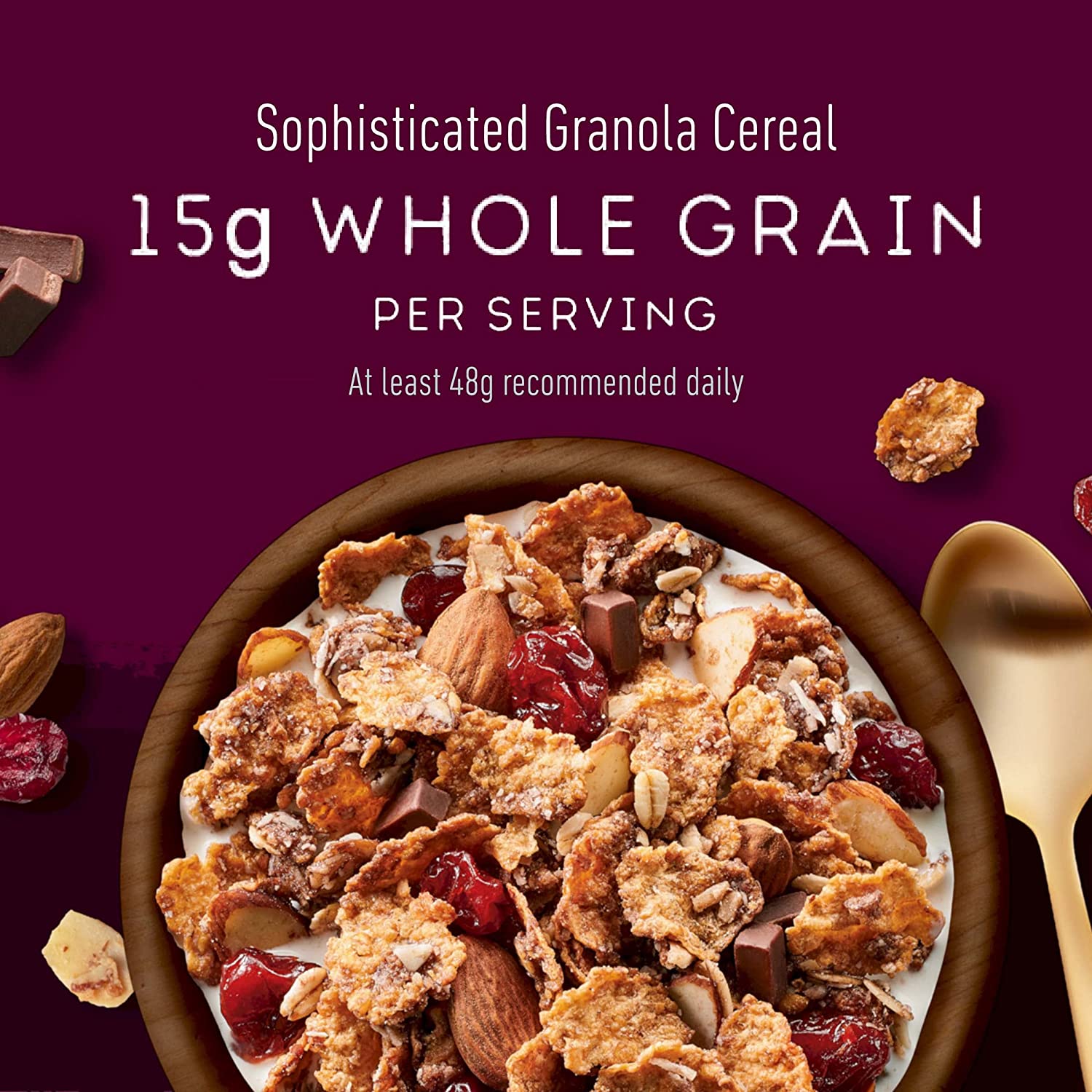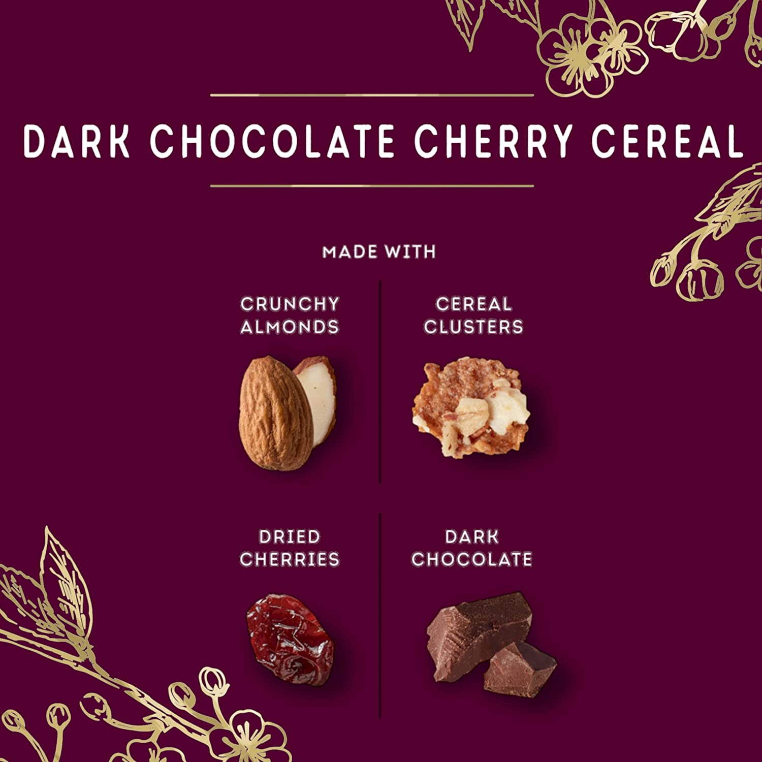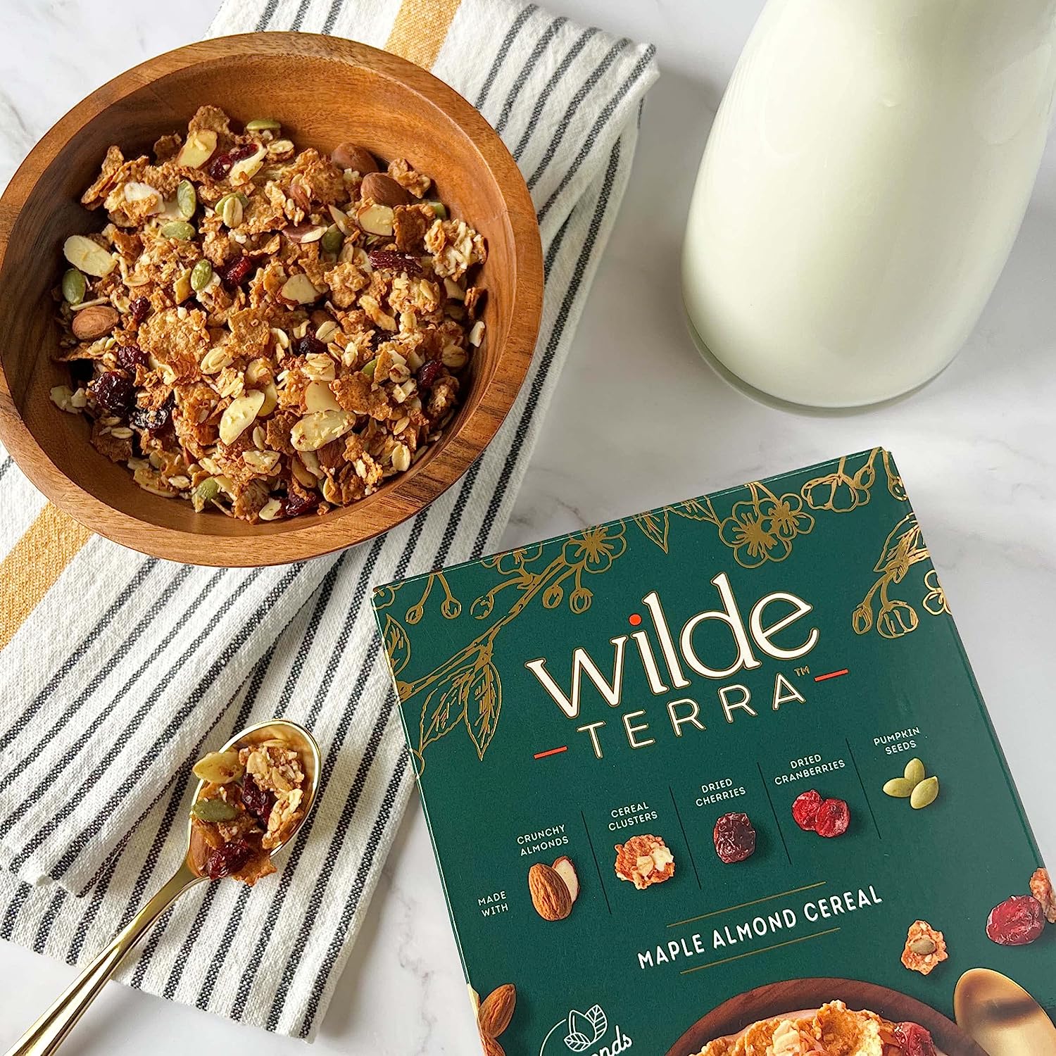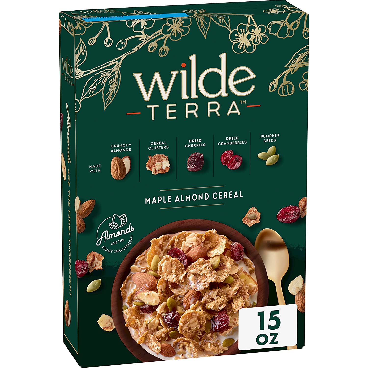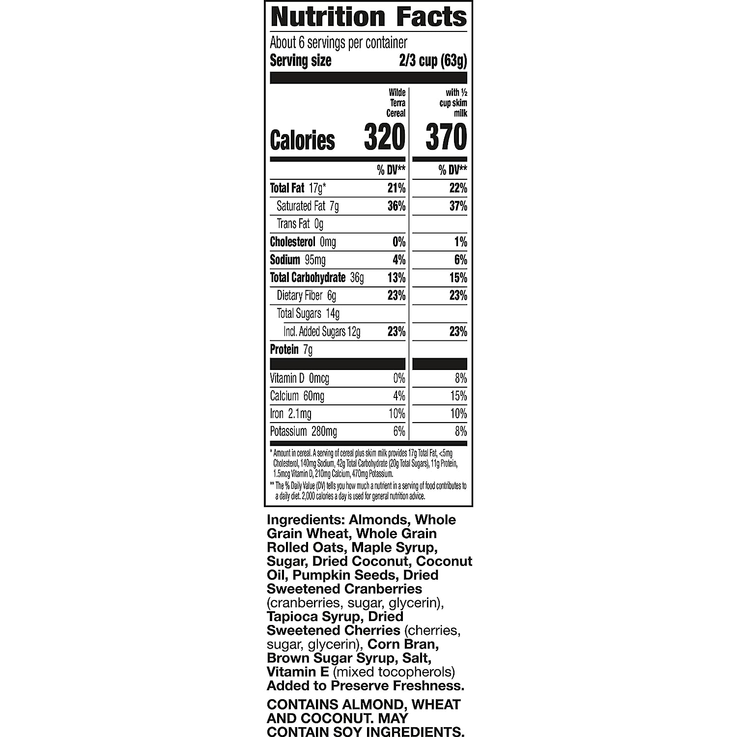 Begin a new day with Wilde Terra Dark Chocolate Cherry Cereal with High Fiber. This breakfast cereal starts with almonds because they are that good. We next add cereal flakes with crunchy cereal clusters for a tasty crunch. A blend of dried cherries and dried coconut provides delicious flavor. Wilde Terra's recipe is more than a wholesome part of breakfast–it's the perfect harmony of taste and hearty goodness. Fill your breakfast cereal bowl with this delicious medley to carry you through your morning. Or pack a bagful for an afternoon snack of fruit and nut mix with cereal flakes. Real ingredients like seeds and nuts help satisfy you. Plus, every serving of this high fiber food is a source of iron and provides 15 grams of whole grains (at least 48 grams recommended daily). This cereal is carefully crafted for quality. Almonds are the first ingredient. Store this cereal in your cupboard as a delicious part of breakfast or a wholesome snack. A recipe with high quality, wholesome ingredients—that's what makes Wilde Terra cereal a breakfast to savor.