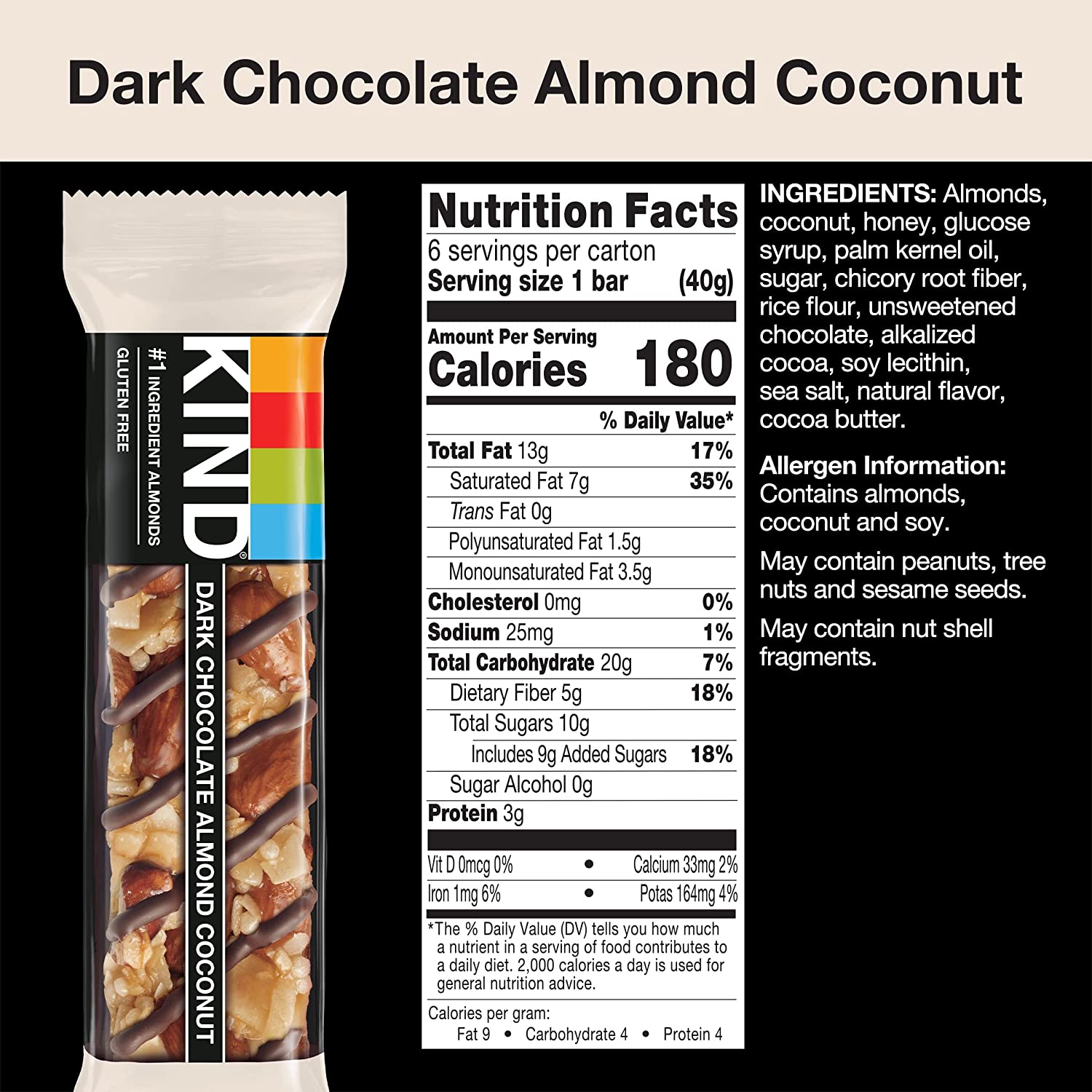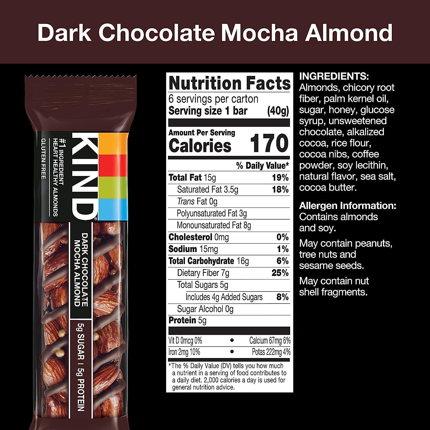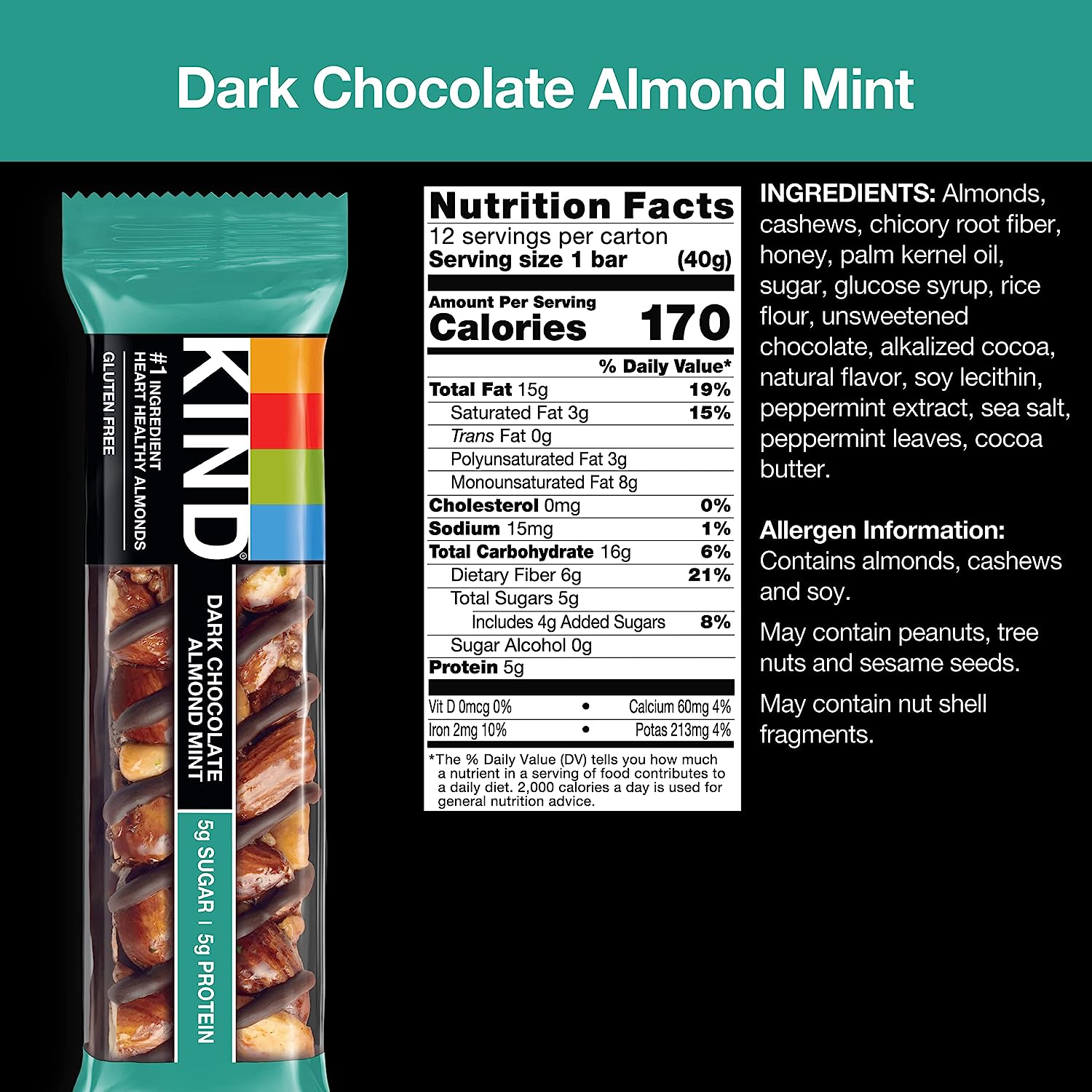 KIND Dark Chocolate Nuts & Sea Salt bars are satisfying gluten free bars packed with nuts and the taste of dark chocolate that you can take anywhere. These KIND nut bars lead with heart healthy almonds as the #1 ingredient. This healthy snack bar combines quality ingredients like almonds, dark chocolate, and sea salt to deliver a delicious taste with a little crunch. These snack bars come packed as individually wrapped snacks for a convenient option that makes eating healthy easier. It's the perfect nutrient-dense pick-me-up when life gets in the way. KIND bars Dark Chocolate Nuts & Sea Salt contain 5 grams of sugar, 6 grams of protein, and are a good source of fiber*. This KIND nut bar is also gluten free, has a low glycemic index, and is made without genetically engineered ingredients. *Contains 14g of fat per bar
