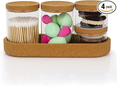 DAPOWER 4 Pack Qtip Holder Vanity Storage Canister for Cotton Ball Cotton Swab Pads Floss, 15-Ounce Clear Glass Apothecary Jar with Lid and Tray, Bathroom Organizer and Storage (4 pack set with tray)