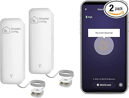 Smarter Living - Smart WiFi Water Sensor & Flood Detector (2-Pack), Phone Notifications via Smart Life and Tuya App, Low Battery Reminder, Easy Setup