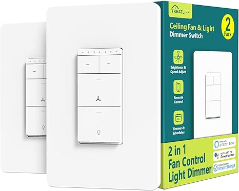 TREATLIFE Smart Ceiling Fan Control and Dimmer Light Switch 2PACK, Neutral Wire Needed, Single Pole 2.4GHz Wi-Fi Fan Light Switch Combo, Works with Alexa, Google Home and SmartThings