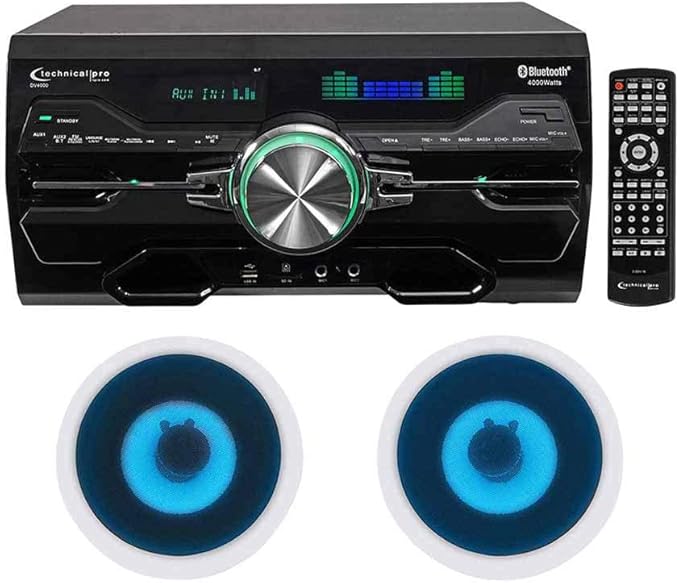 Technical Pro Professional 4000w Receiver/Amplifier/DVD Player Bluetooth/USB/FM Bundle with (2) Rockville HC85B-LED 8" 700 Watt in-Ceiling Home Theater Speakers w/Blue LED