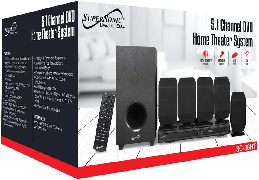 Bring home the entertainment 5 1 Channel Surround Sound System Supports DVD/CD/VCD/SVCD/MP3/Picture CD/CD-R/CD-RW 2 Karaoke Microphone Jack Built-in USB Input FM Radio
