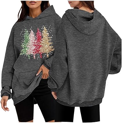 Oversized Christmas Sweatshirt for Women Holiday Graphic Hoodies Warm Long Sleeve Pullover Drawstring Sweatshirt