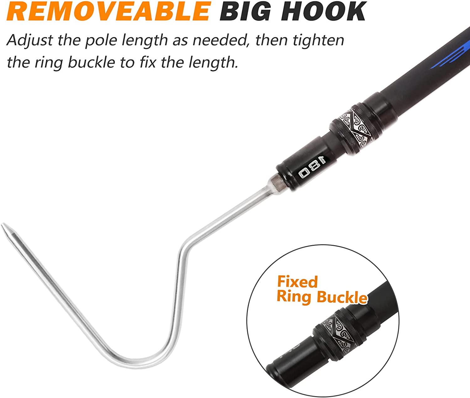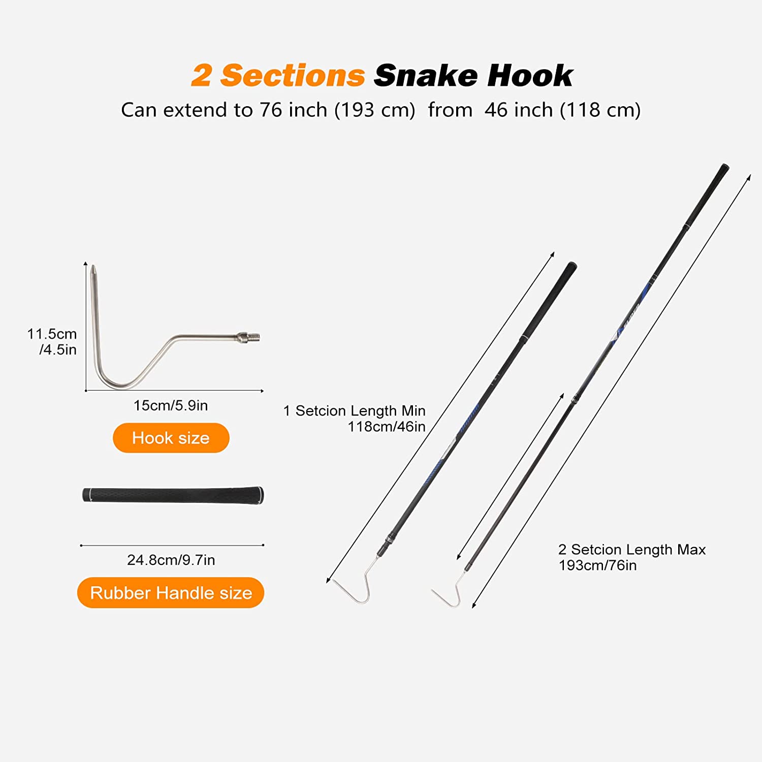 • 2 sections snake hook (gancho de serpiente)can extend to 76 inch (193 cm) from 46 inch (118 cm). The extended length keeps you at a safer distance when handling unidentified species compared to the standard length.