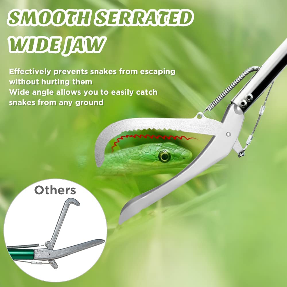 • 【No Harm to Snakes】The smooth serrations allow for a strong grip, and the wide angle allows you to easily catch snakes from any surface. Wide jaws, able to accommodate snakes of various sizes. This snake tongs provides a way to catch snakes and other reptiles without causing any harm.