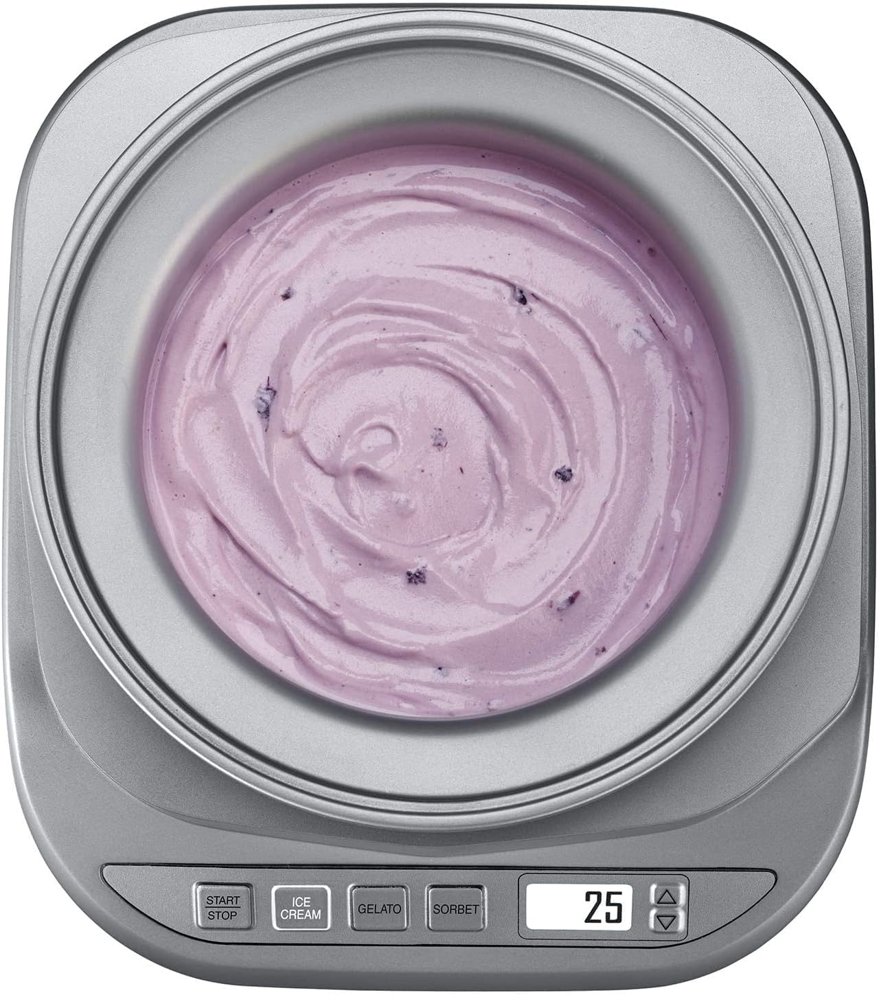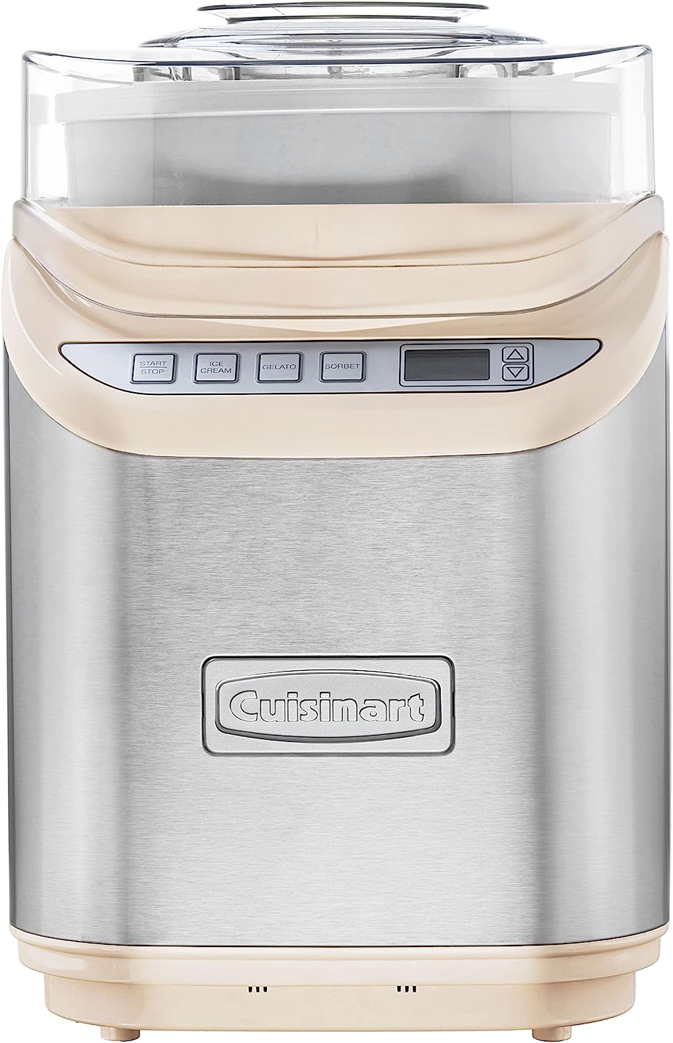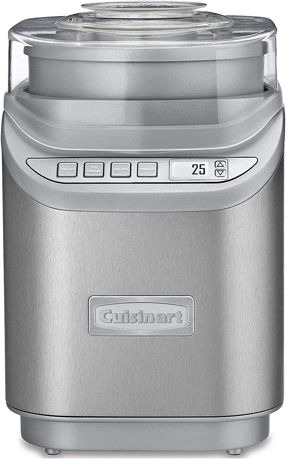 The Cuisinart Electronic Ice Cream Maker makes 2 qts of ice cream in just 20 minutes! The machine includes a lid with ingredient spout and integrated measuring cup, a 2 qt freezer bowl and an improved paddle for faster processing time. The housing is a sleek brushed chrome with a simple LCD display with pushpad settings for ice cream, gelato or sorbet. It's also great for making frozen yogurt! The machine even features a count-down timer and shuts off automatically. Includes full instructions and a selection of recipes. Manufacturer's 3 year limited warranty. Measures 9.7\" l x 8.6\" w x 13.2\" h.