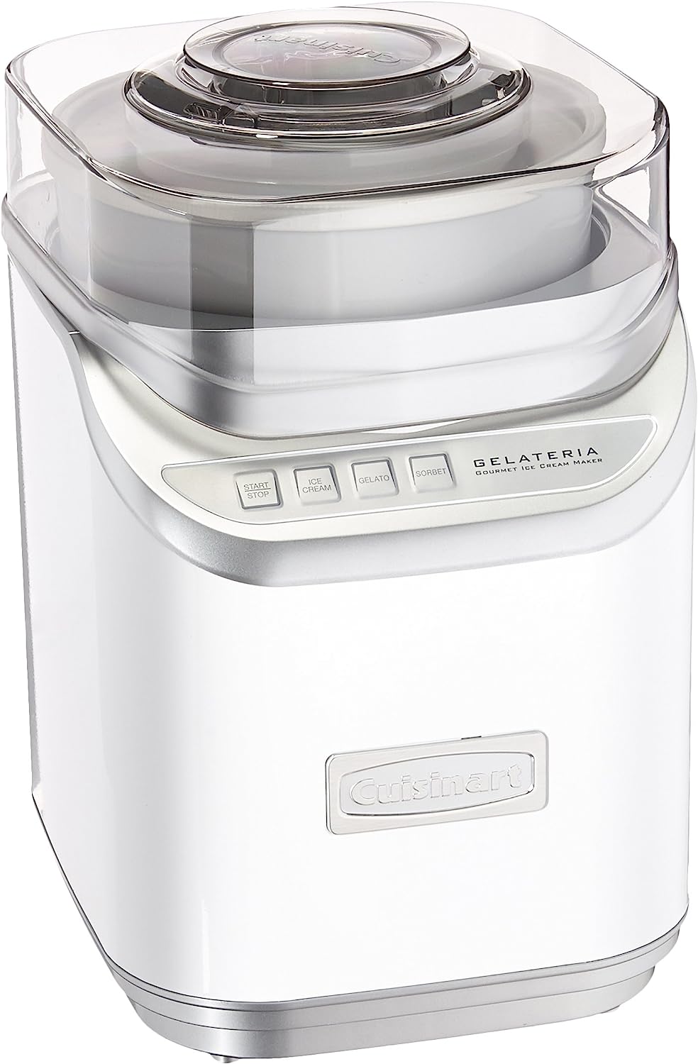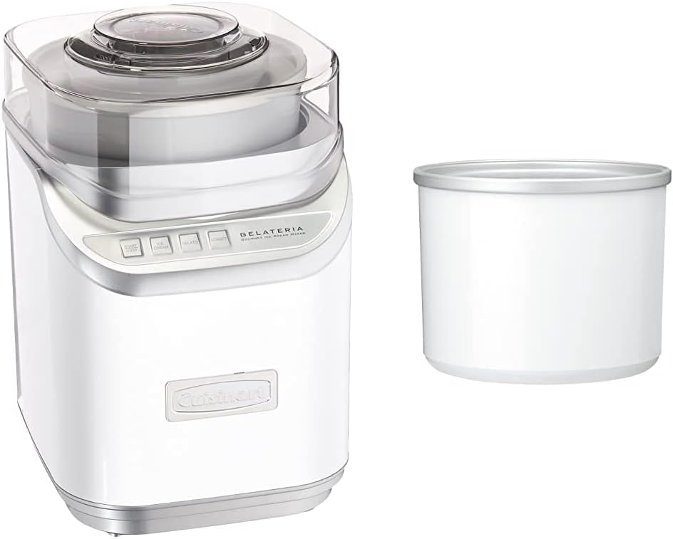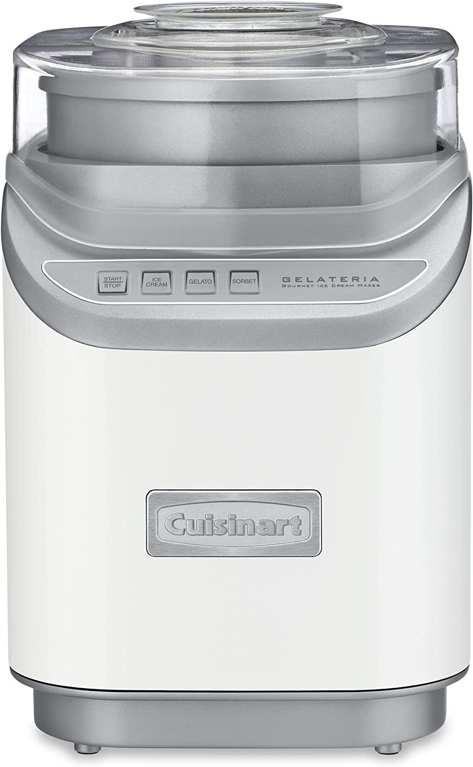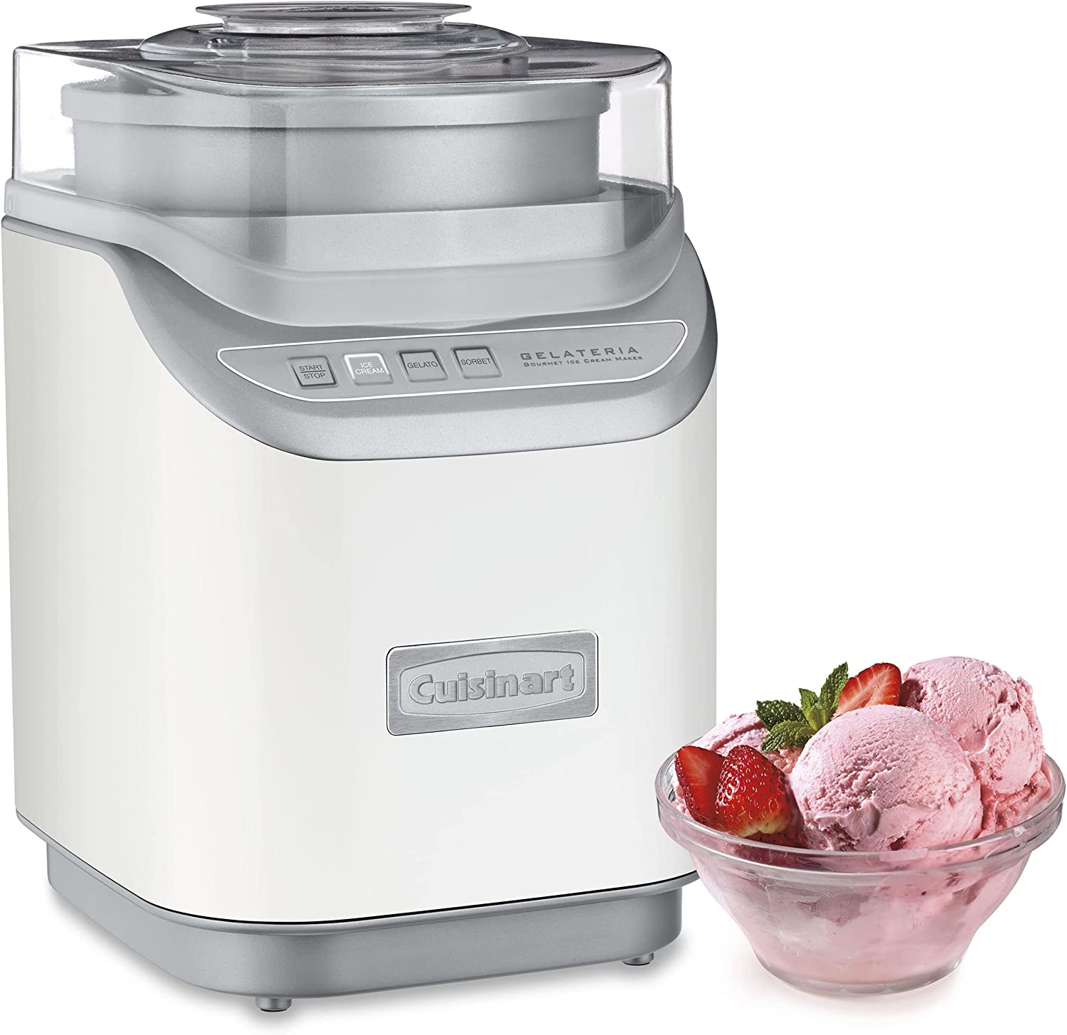 The Cuisinart Electronic Ice Cream Maker makes 2 qts of ice cream in just 20 minutes! The machine includes a lid with ingredient spout and integrated measuring cup, a 2 qt freezer bowl and an improved paddle for faster processing time. The housing is a sleek brushed chrome with a simple LCD display with pushpad settings for ice cream, gelato or sorbet. It's also great for making frozen yogurt! The machine even features a count-down timer and shuts off automatically. Includes full instructions and a selection of recipes. Manufacturer's 3 year limited warranty. Measures 9.7\" l x 8.6\" w x 13.2\" h.