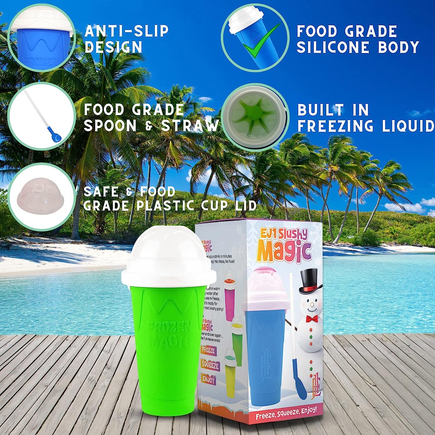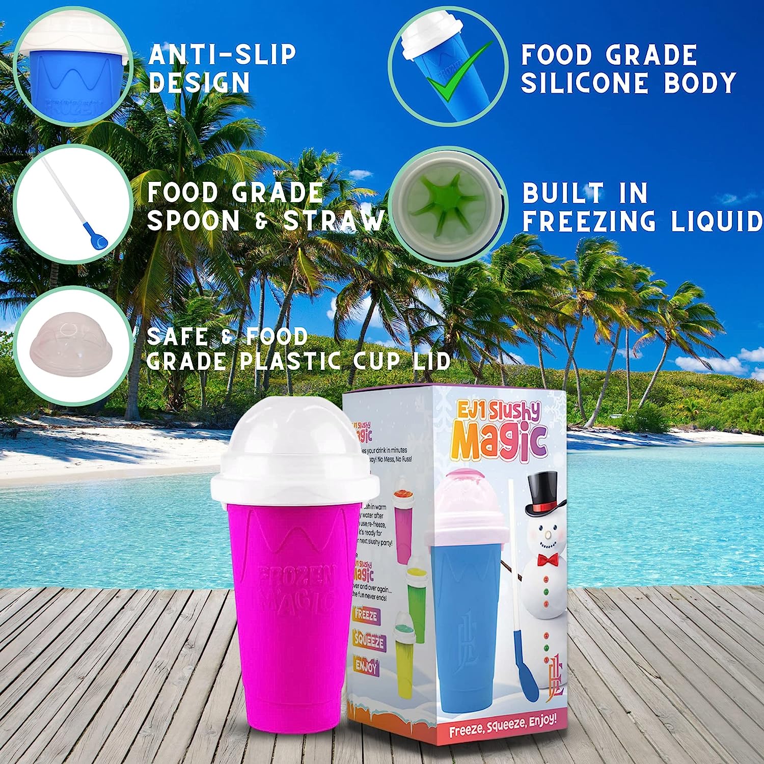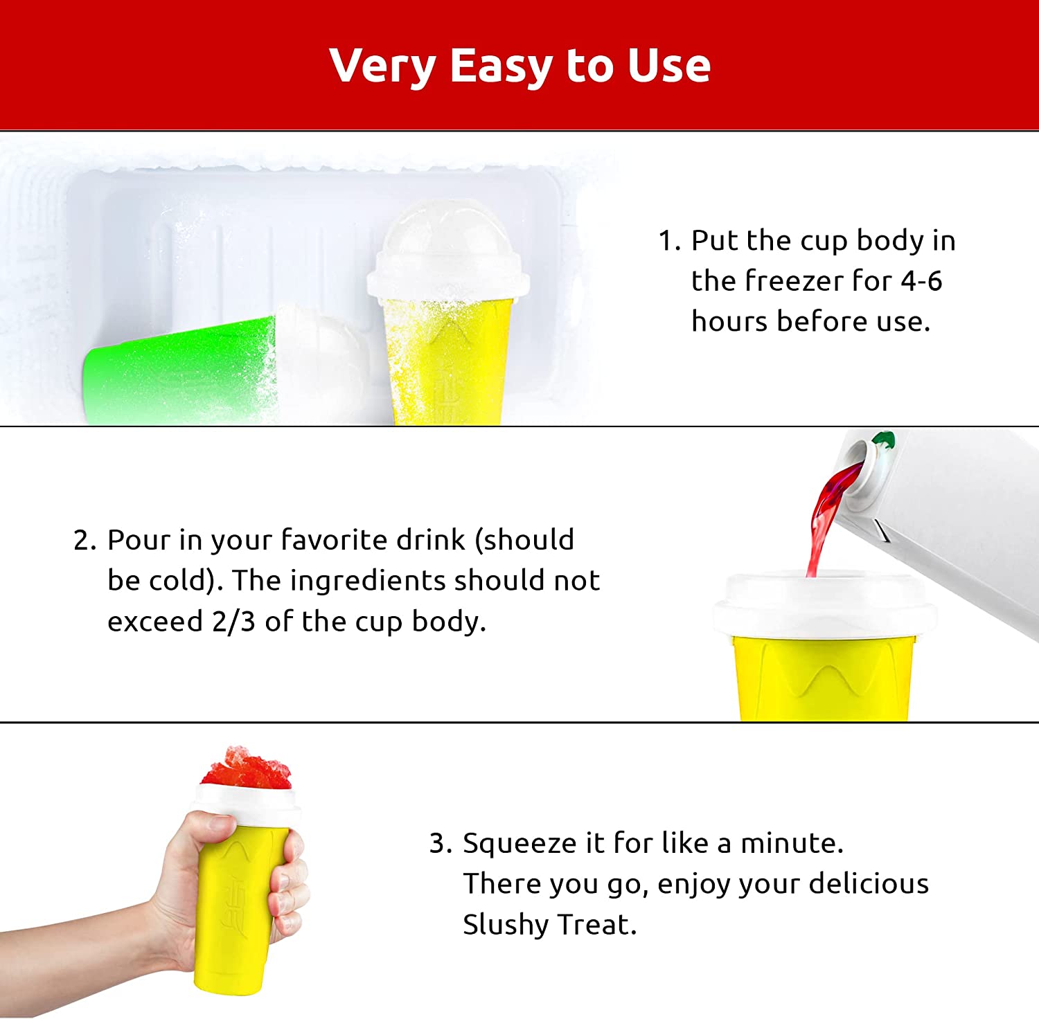 • Quick Freeze Technology : Beat the heat with EJ1 slushie cup. It has built-in freezing liquid, which transforms your favorite drinks into refreshing slushy. The inner layer of slushie maker cup exchanges heat with the ingredients poured-in creating quick delicious slushies. With the advanced technology used in this cool stuff frozen magic squeeze cup, your slush retains its original flavors without using any additional ice to achieve that semi-frozen consistency.